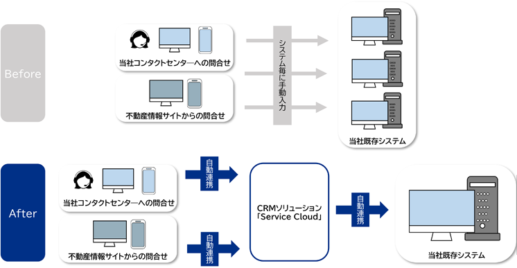 コンタクトセンターへは、電話や当社のお部屋探しサイトだけでなく、不動産情報サイトなど、様々な方法でお問い合わせを頂いております。そのような中、情報の入力などの手作業で行う業務は負担が大きくなっておりました。これらの課題解決のためにCRMソリューション「Service Cloud」を導入し、情報の自動入力・一元管理を実現することで、業務負荷の軽減や業務効率化に取り組んでおります。