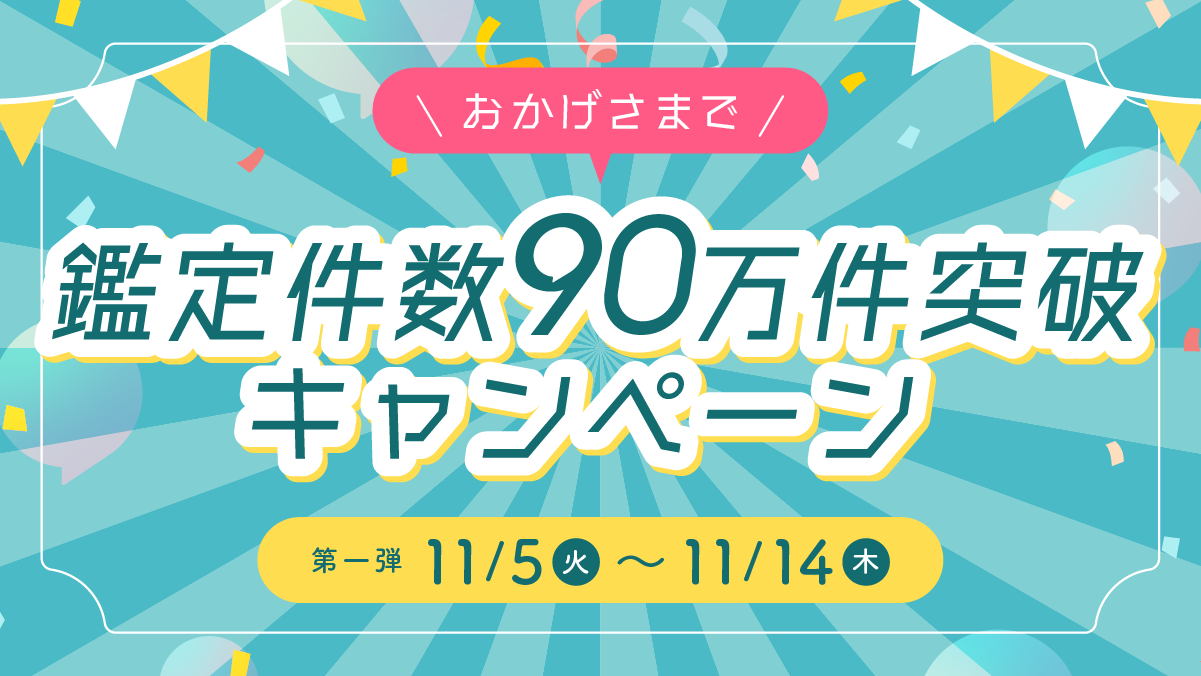 鑑定件数90万件の感謝をこめて、当選確率90%のクーポンをご用意いたしました。鑑定チケット事前購入(※)で使えるクーポンなど、さまざまなクーポンの中からランダムでプレゼントいたします。2024年11月5日(火)より、順次「運営からのお知らせ」にメッセージをお送りしますのでそちらをご確認ください。