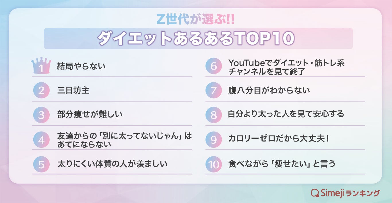 【Simejiランキング】Z世代が選ぶ!!「ダイエットあるあるTOP10」