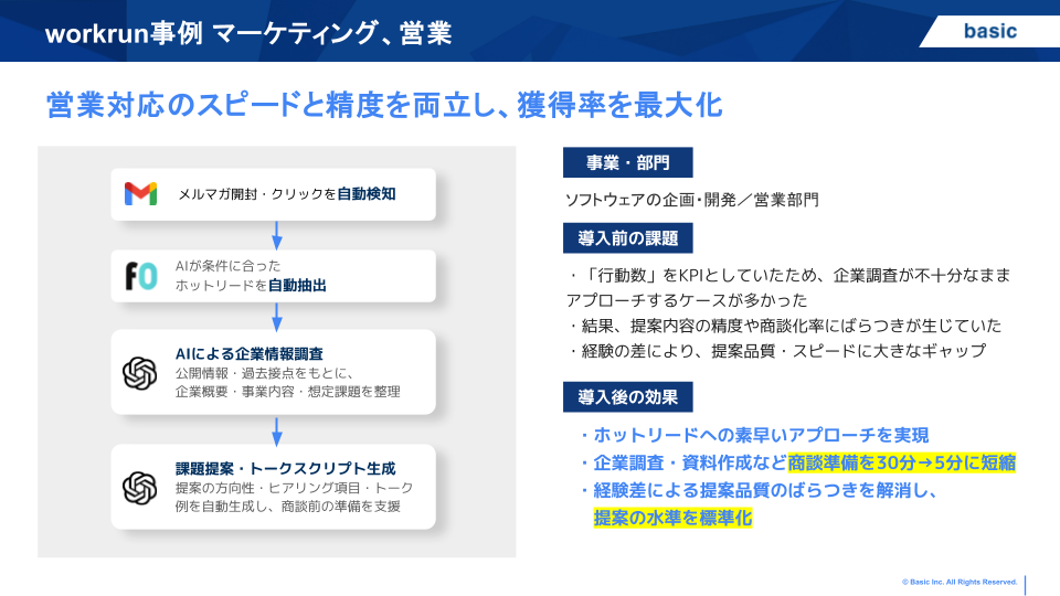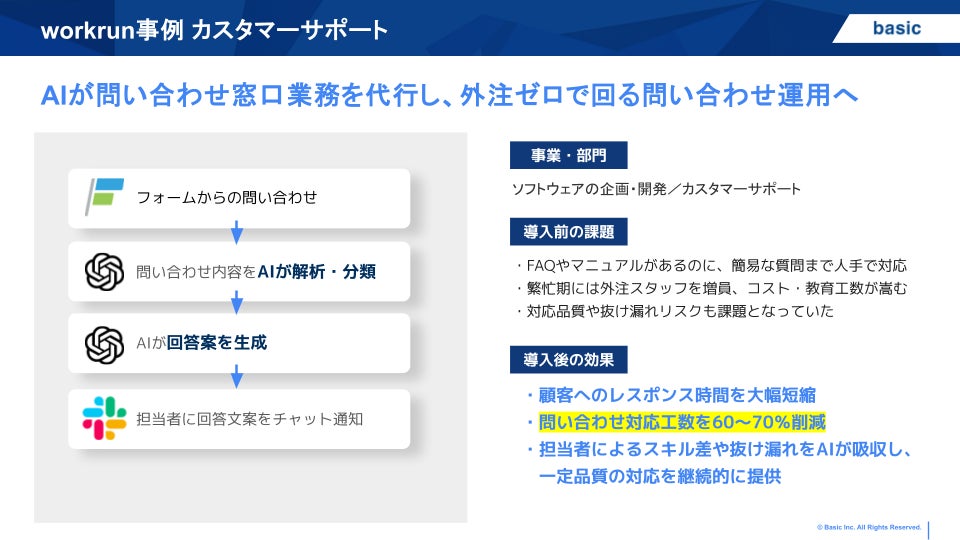 ベーシックは「事業の成長を人の数で解決しない」をパーパスに掲げるAIワークフローカンパニーです。AIを活用して業務を自動化する「workrun」、業界・業種問わず対応可能なAIエージェントプラットフォーム「AIBOW」が企業の生産性向上を支援いたします。他にも、BtoBマーケティング支援ツール「ferret One」、フォーム作成管理ツール「formrun」など複数のプロダクトを展開し、AIとテクノロジーを活用して課題解決を支援いたします。