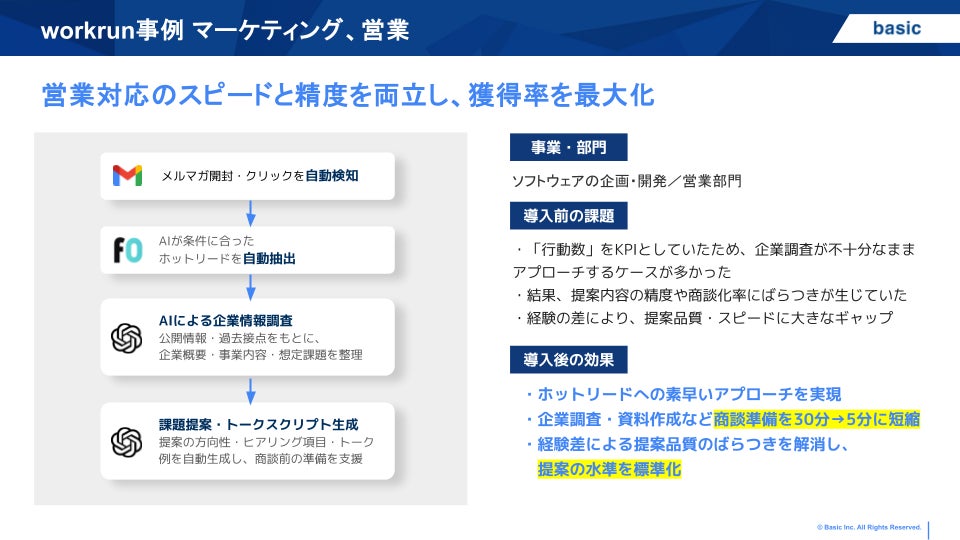 株式会社ベーシック(東京都千代⽥区、代表取締役:秋⼭勝、以下「当社」)は、ツール間で業務フローをAIが自律実行するAIワークフローツール「workrun(ワークラン)」の提供を本日開始したことをお知らせします。