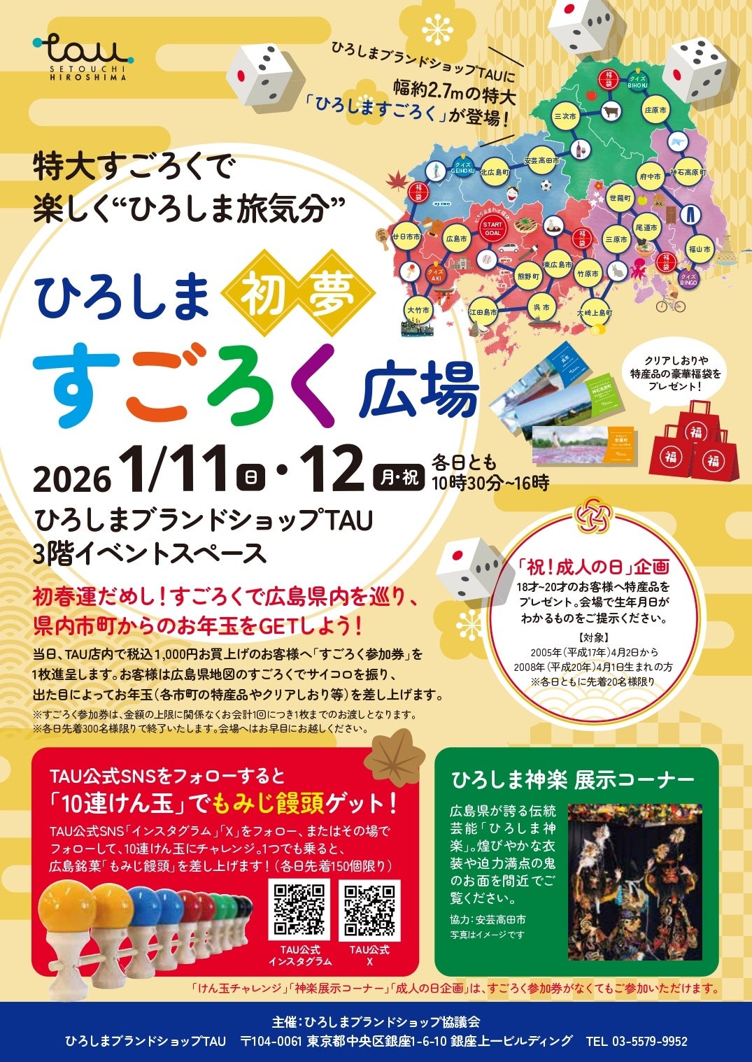 広島県内19市町等が参加する「ひろしまブランドショップ協議会」主催で、1月11日(日)、12日(月・祝)の2日間、「ひろしま初夢すごろく広場」を開催します!