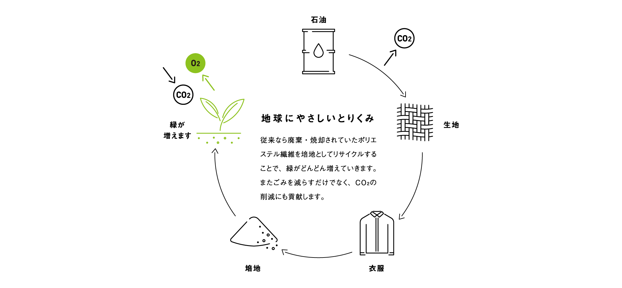 一部の商品には廃棄される洋服などの繊維から作ったポリエステル繊維リサイクル培地を使用し、衣類の焼却処分によるCO2排出の削減に取り組んでいます。