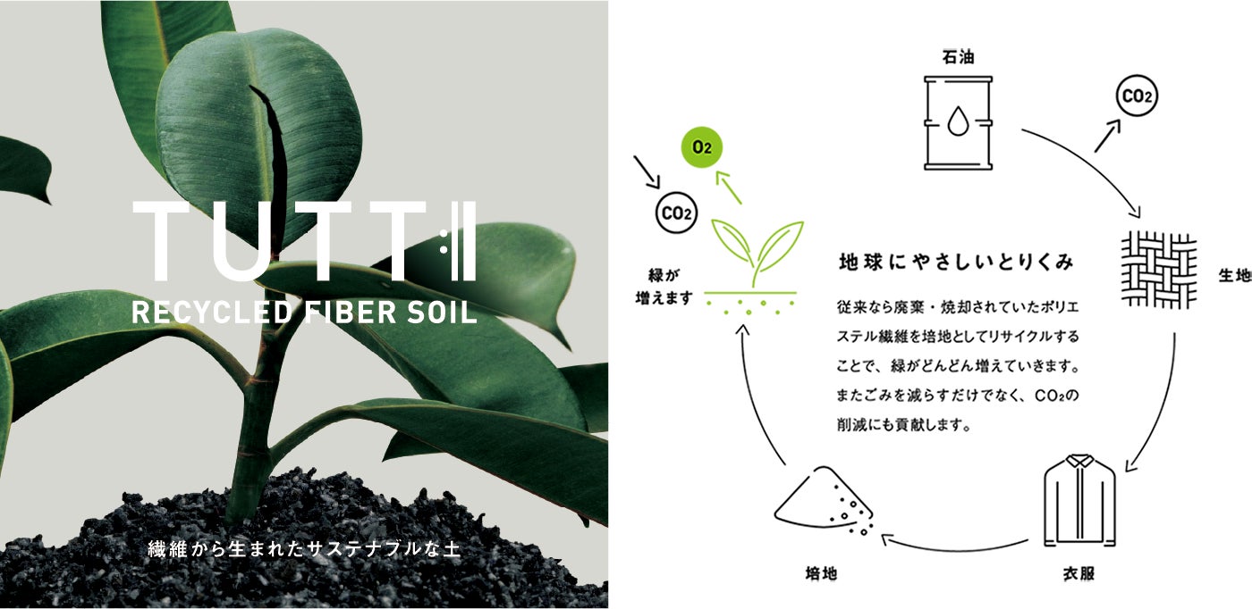 TUTTI(トゥッティ)は、スタイレム瀧定大阪株式会社(本社:大阪市浪速区、代表取締役社長:瀧隆太、以下「スタイレム」)が展開するリサイクル培地です。従来なら廃棄・焼却されていたポリエステル繊維を培地としてリサイクルすることで、緑がどんどん増えるだけでなく、ゴミやCO2排出の削減にも貢献します。