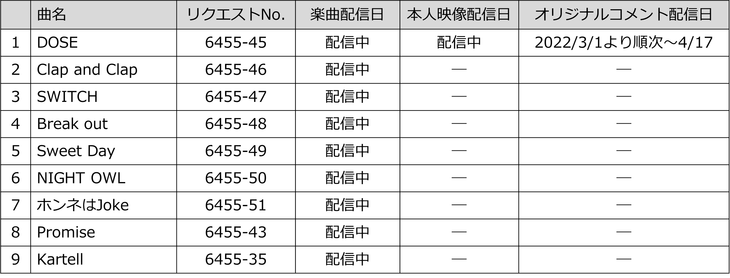 配信予定が変更になる場合があります。楽曲によって配信機種は異なります。なお、本人映像およびオリジナル