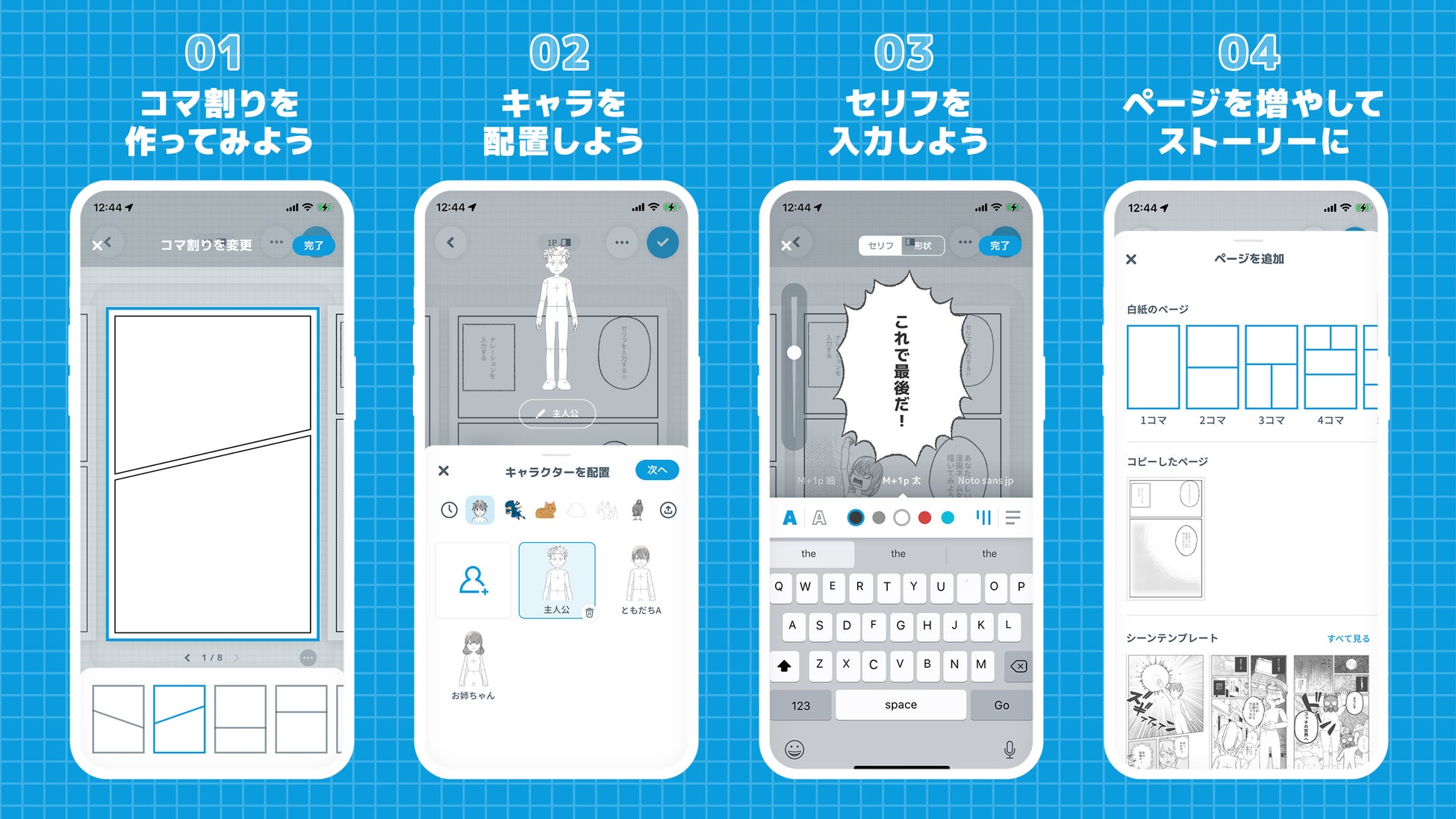4 ページを増やしてストーリーに:アイテム・背景・オノマトペなども配置してより漫画らしい表現にしていきましょう。