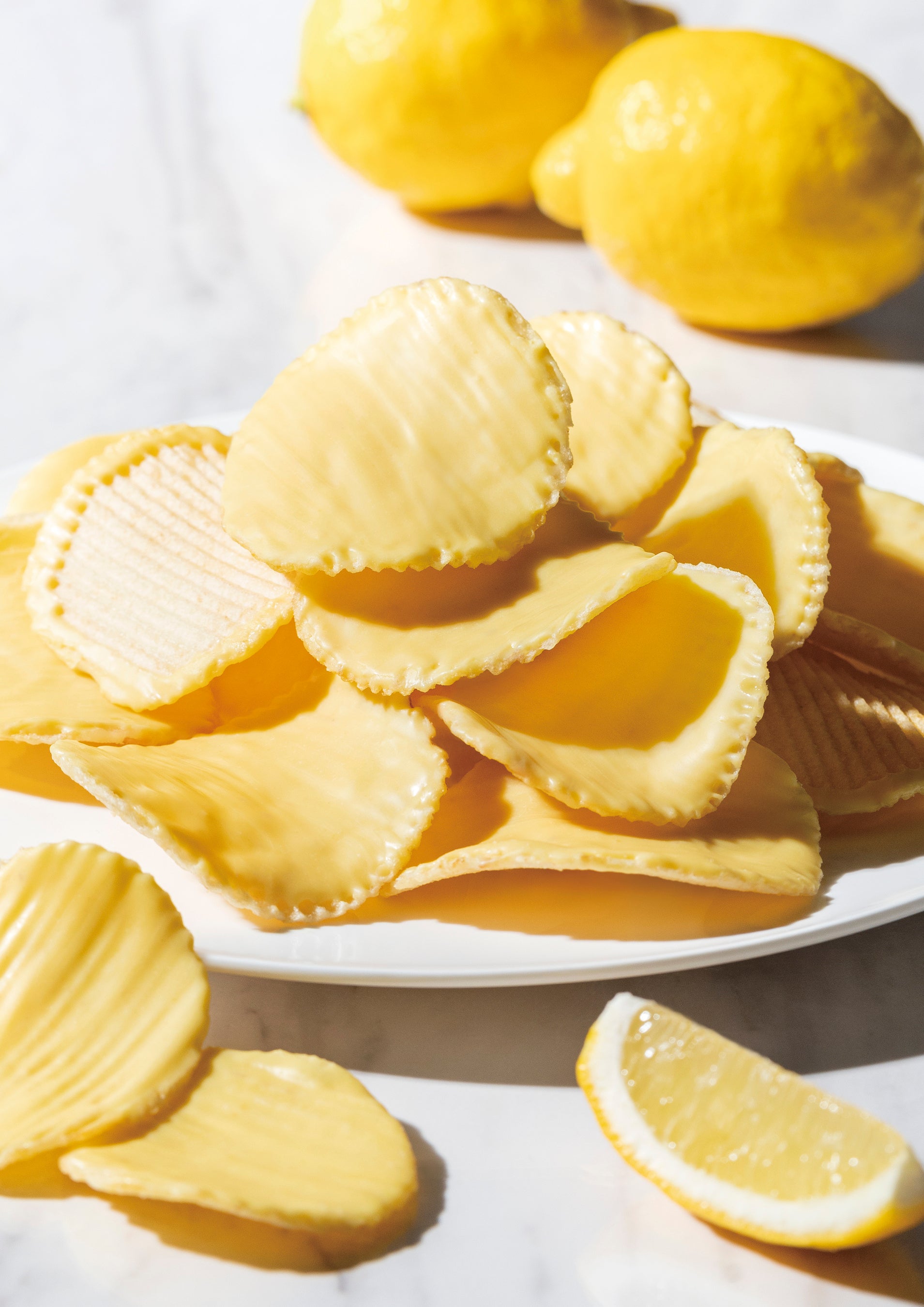 塩が効いたサクッと食感のポテトチップスにレモンチョコレートをコーティングしました。爽やかなレモンの酸味とホワイトチョコレートの甘味が絶妙なバランスで手が止まらなくなる美味しさです。