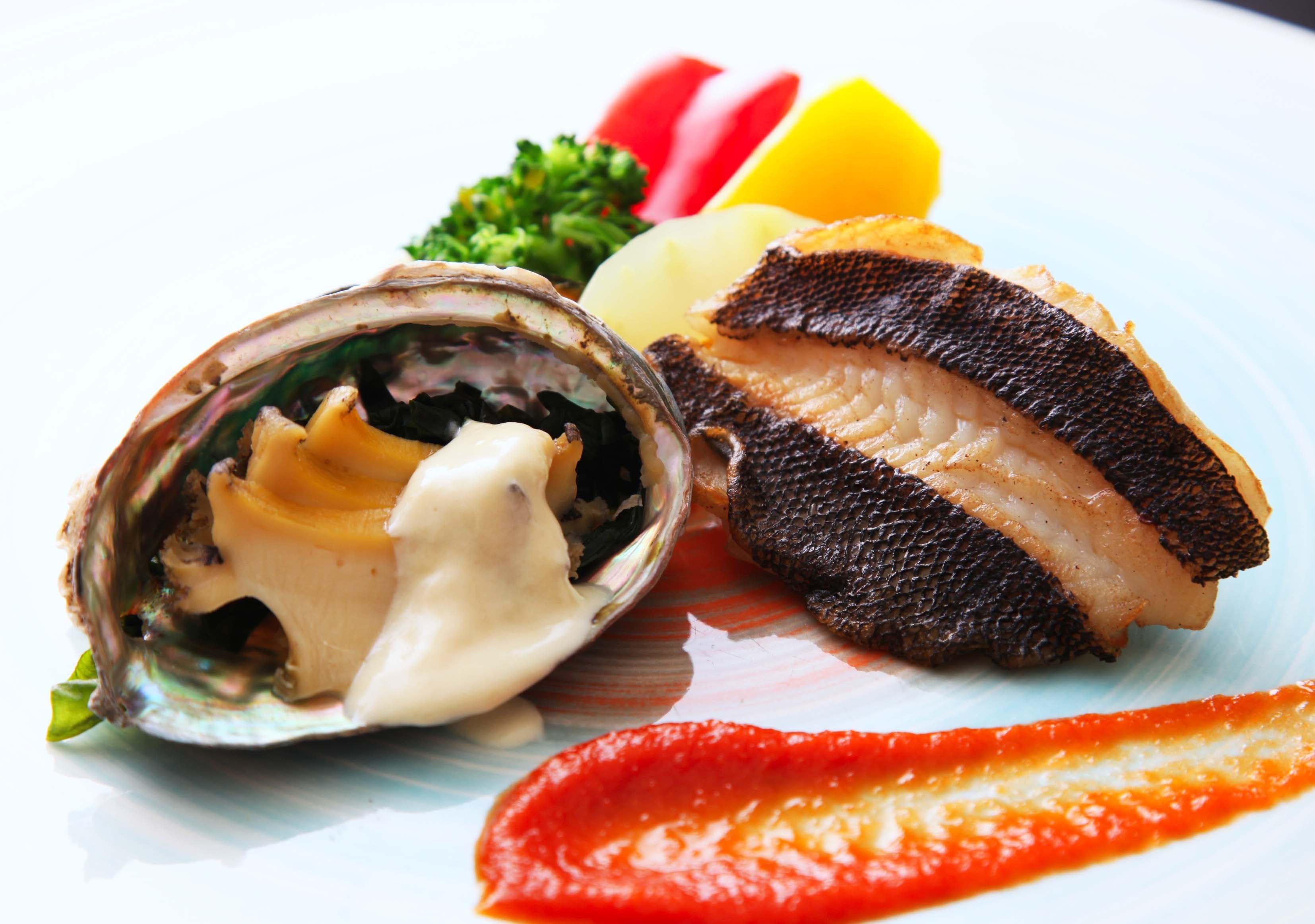 - Poisson 夏アワビのブレゼと旬魚すずきのポワレ すだち香る白ワインのソースで