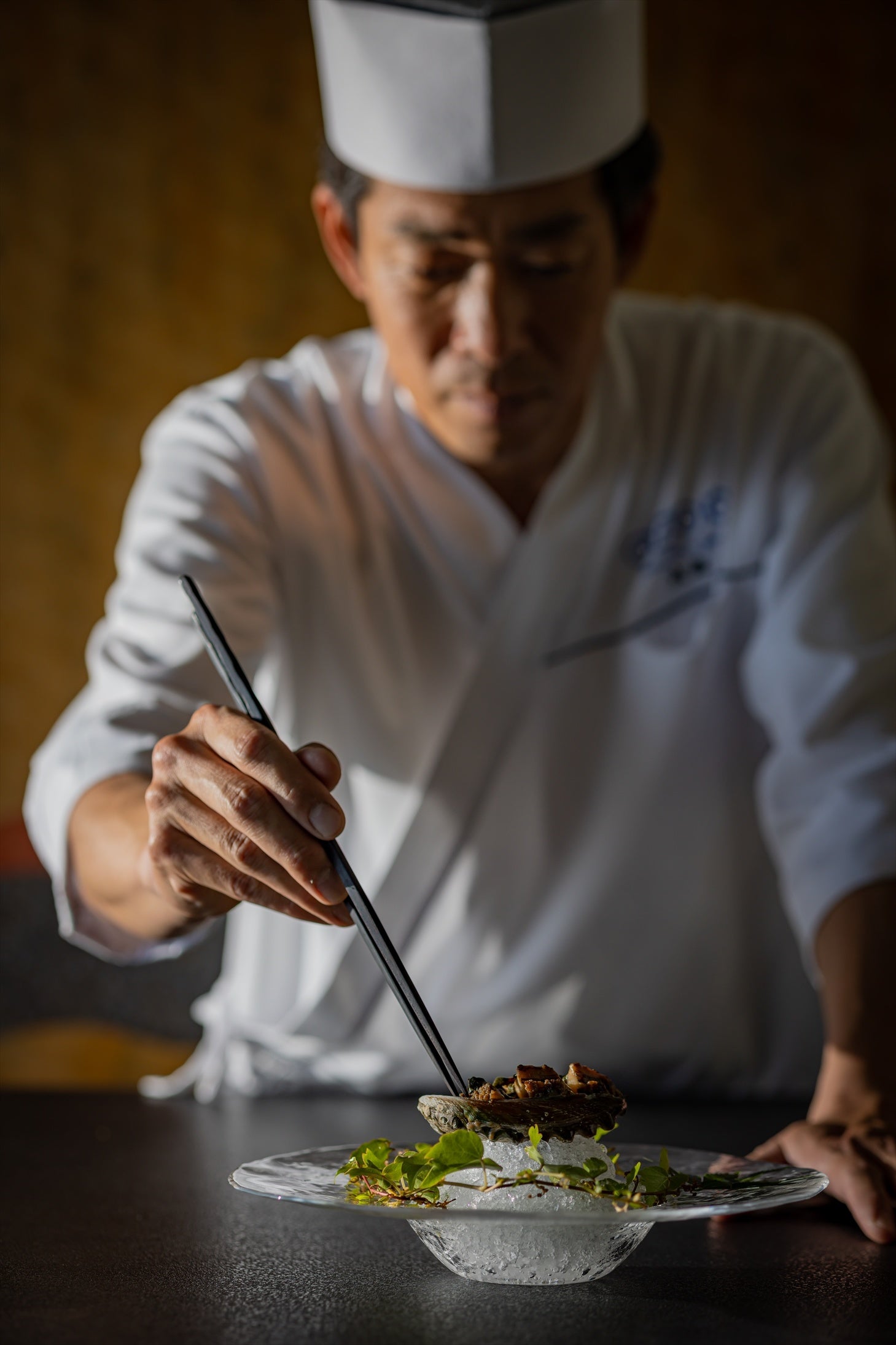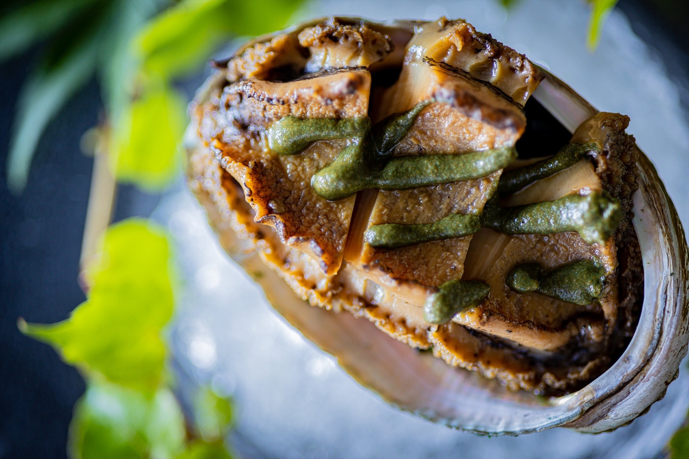- 強 肴 徳島県産アワビの冷製 酒蒸し仕立て 鳴門「福寿醤油」を使った肝醤油掛
