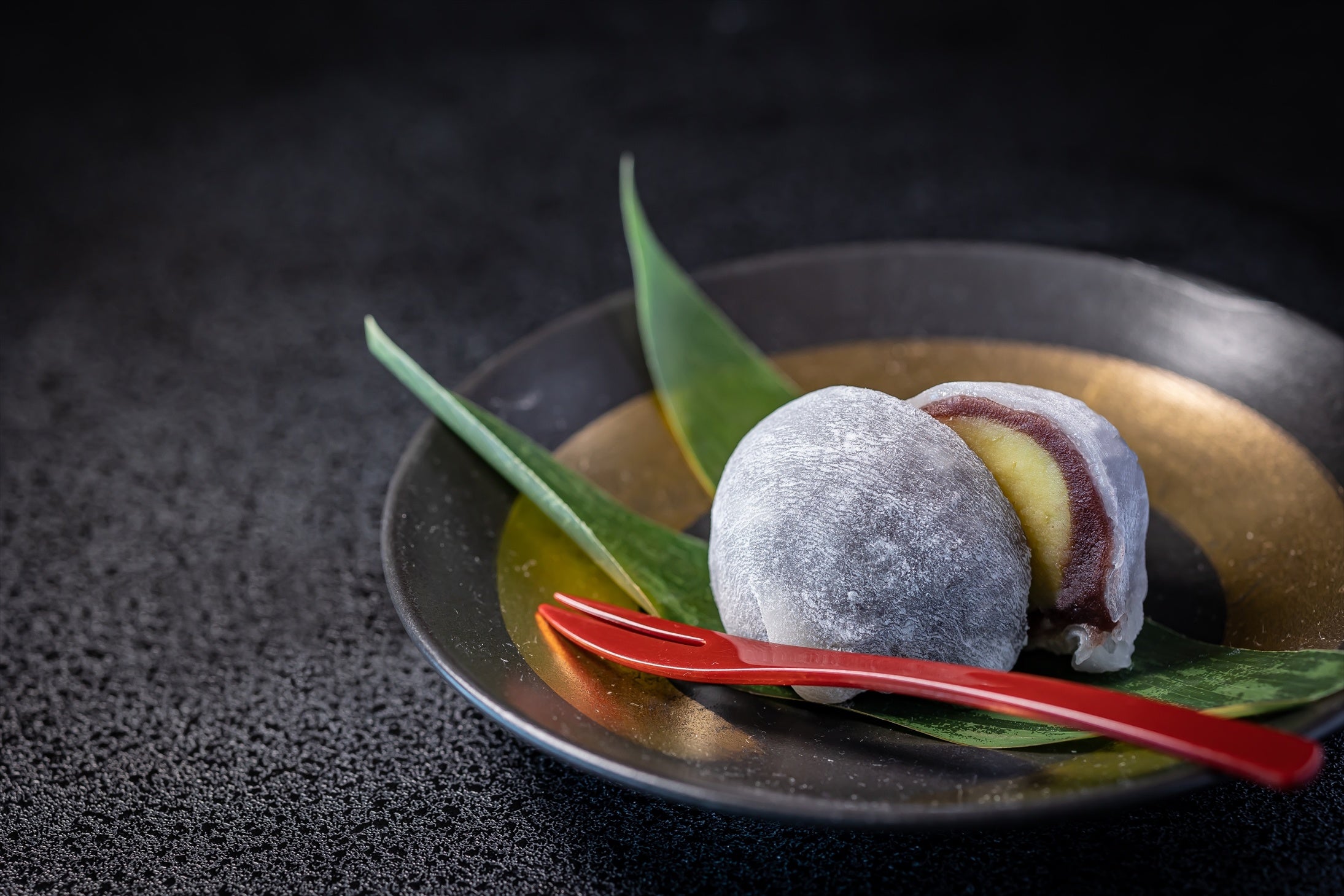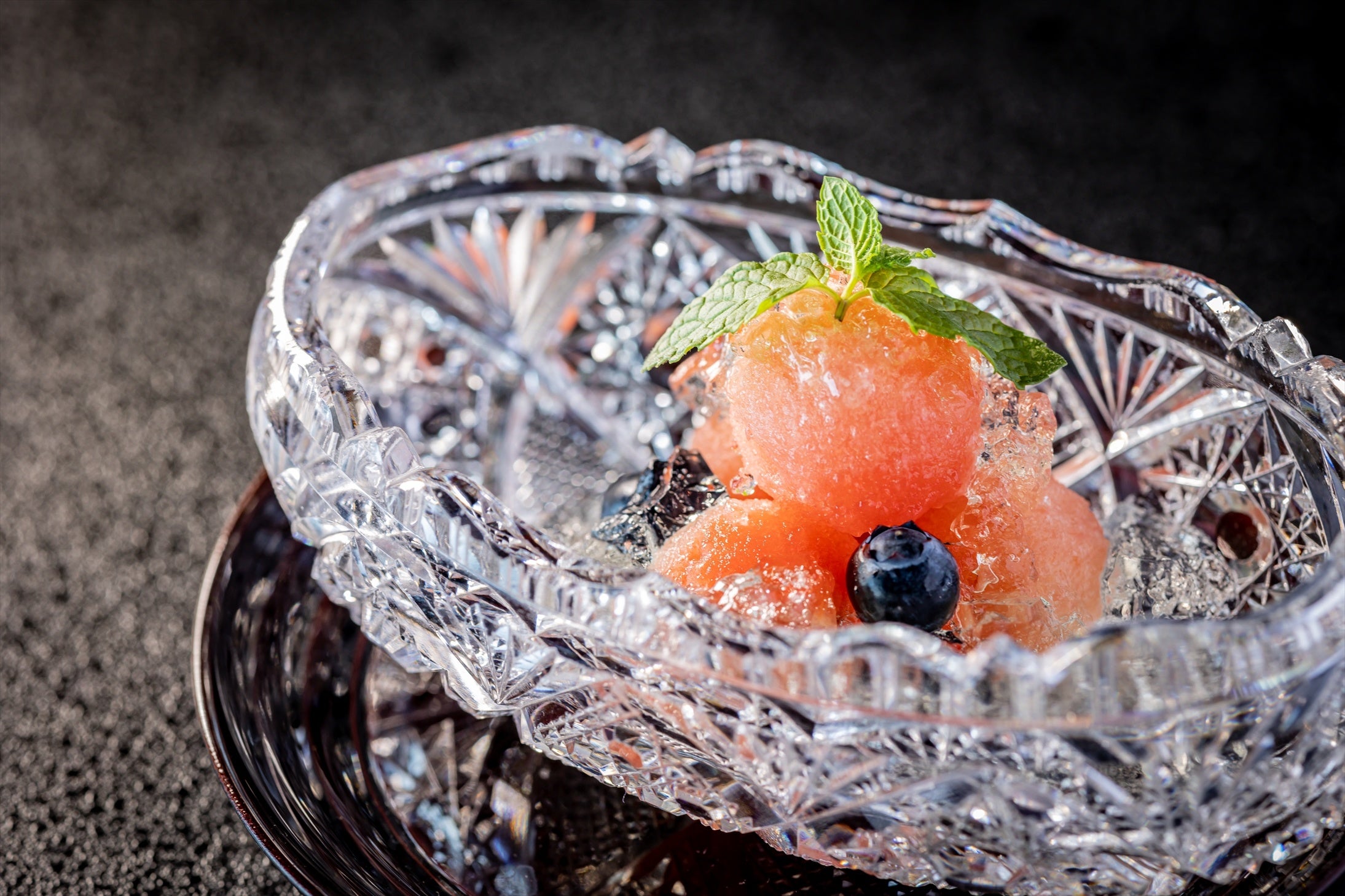 - 甘 味 鳴門金時の大福餅/すいかとブルーベリーの白ワインジュレ掛け ミント
