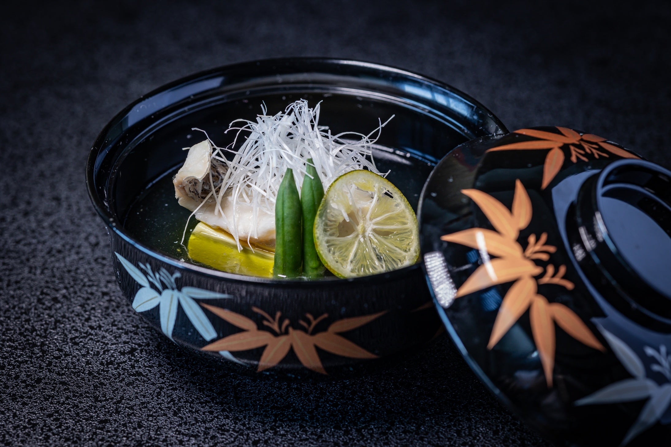 - 吸 物 福っこの潮仕立て/徳島県産ブランド玉子「あわそだち」で作る玉子豆富/インゲン/白髪葱/巣立ち