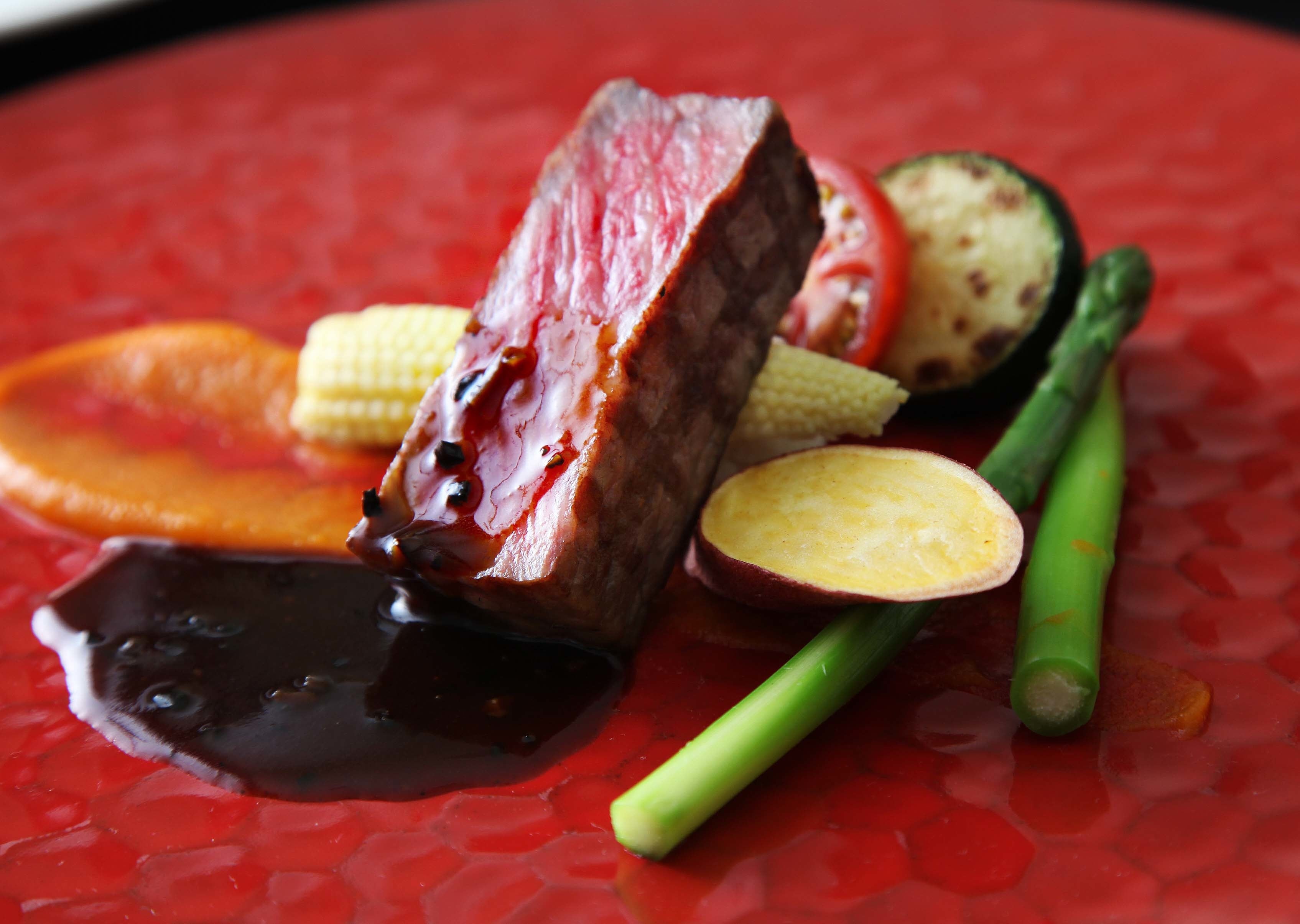 - Viande 香ばしく焼いた銘柄牛「阿波牛」ロース肉のグリエ ズッキーニ、なす、完熟トマトの重ね焼と共に トリュフ香るソース