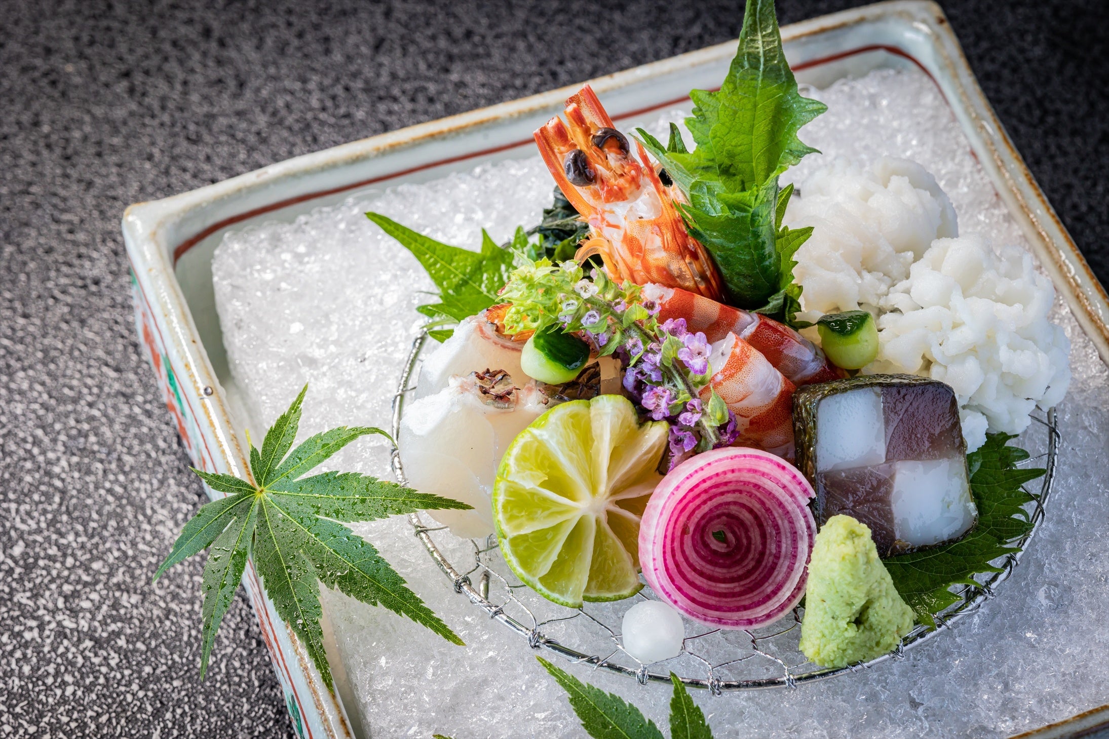 - 造 り 鳴門鯛松皮造り/鳴門産車海老油霜/まぐろと烏賊の市松造り/鳴門産鱧の湯引き