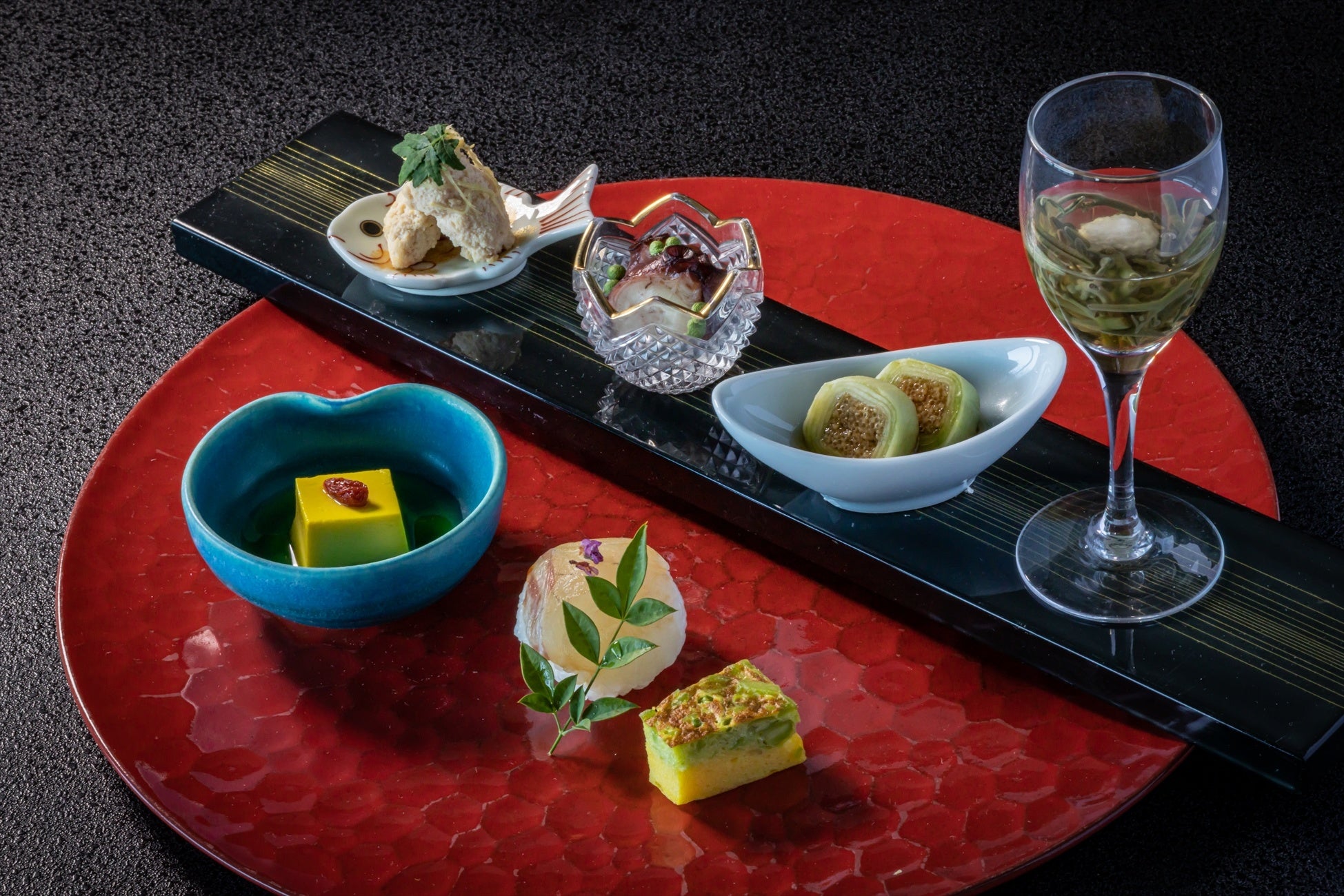 - 前 菜 鳴門鯛手鞠寿司/たこ柔らか煮/枝豆福紗焼/鯛の子旨煮/とうもろこしの葛寄せ/子持昆布砧巻/じゅんさいとろろ