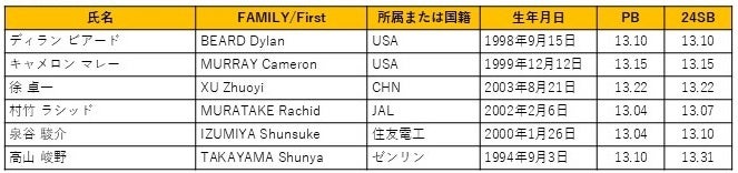 男子110mハードルには、日本記録保持者で昨年のパリオリンピック5位入賞の村竹ラシッド(JAL) 、同じく日本記録保持者で2023年ブダペスト世界選手権5位入賞の泉谷駿介(住友電工)、オリンピック2回、世界選手権3回の出場歴を持つ高山峻野(ゼンリン)が参戦。