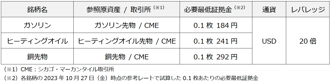 今回の銘柄追加では、日常生活で身近な存在のガソリンや米国で消費される暖房用油のヒーティングオイル、脱炭素資源として需要が拡大する銅先物を参照原資産とする商品CFDの取り扱いを開始し、「CFD」のラインナップをさらに拡充しました。これにより、当社のCFD取引サービスの取扱銘柄数は154銘柄となります。
