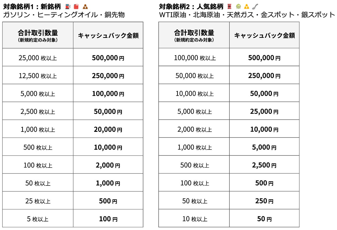 対象期間中のガソリンの新規建て取引数量が6,000枚、WTI原油の同数量が3,000枚の場合、ガソリンで100,000円、WTI原油で10,000円の合計110,000円をキャッシュバックいたします。