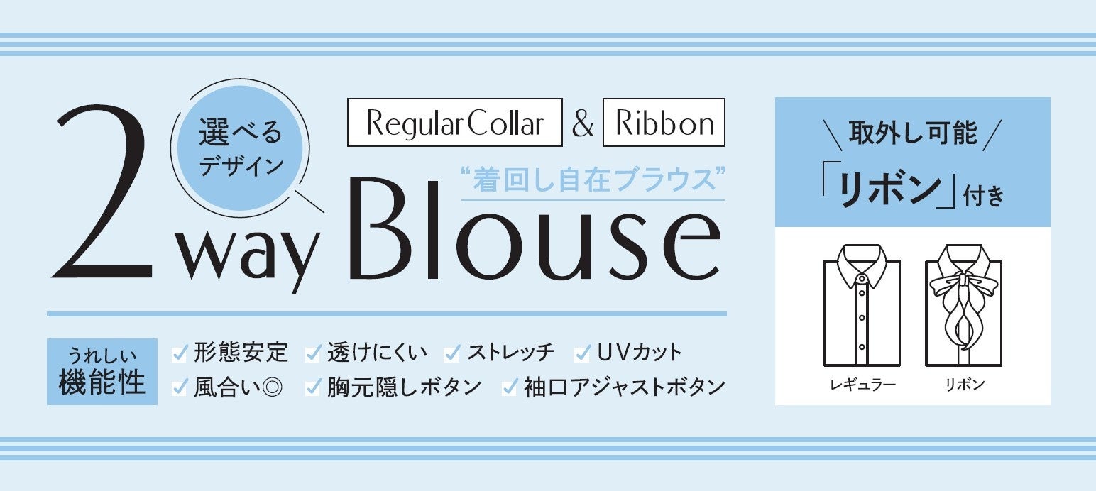また、特殊な糸を使用し透けにくく※注1、UVカット効果※注2を備え、胸元の開きを抑える隠しボタンや袖口アジャスト釦など、細部まで機能性にこだわった設計となっています。一枚あれば様々なシーンで活躍する、まさに"万能ブラウス"です。