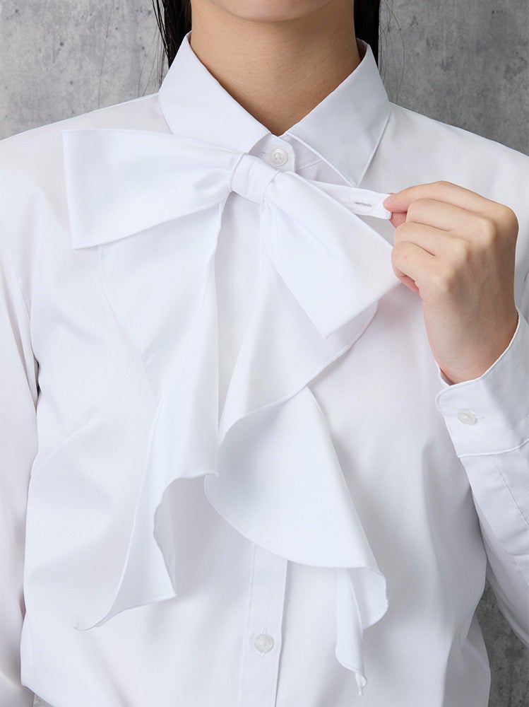 本ブラウスの最大の特長は、取り外し可能なリボンにより、着用シーンに合わせて2通りの着こなしが楽しめる点です。リボンを付ければ華やかな印象に、外せば就活などのフォーマルシーンにも対応可能な白無地デザインとなります。リボンは予め結び目が固定されているため、取り付けが簡単で身だしなみを整える手間を省けます。