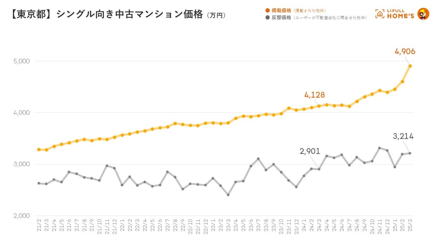 首都圏の中古マンションの掲載物件平均価格は、シングル向き物件が4,138万円(前年同期比+17.0%)で3ヶ月連続、ファミリー向き物件が4,540万円(同+14.3%)で4ヶ月連続過去最高*1価格を更新しました。特に東京23区では、シングル向きが初の5,000万円台となる5,260万円で前年同月比+20.1%、ファミリー向きも初の8,000万円台となる8,270万円で前年同月比+34.8%(+2,133万円)と大きく上昇し、首都圏の中古マンションの価格上昇を牽引しています。