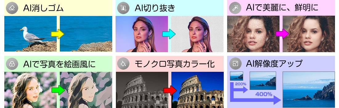 使いやすいインターフェースと強力なAIアルゴリズムにより、プロの写真編集作業を簡素化し、高品質な仕上がりを実現します。写真の切り抜きや、不要な箇所の除去を実現。さらに高精度なノイズ除去や鮮明化による美麗化や、色調を補正、モノクロ写真のカラー化までできます。