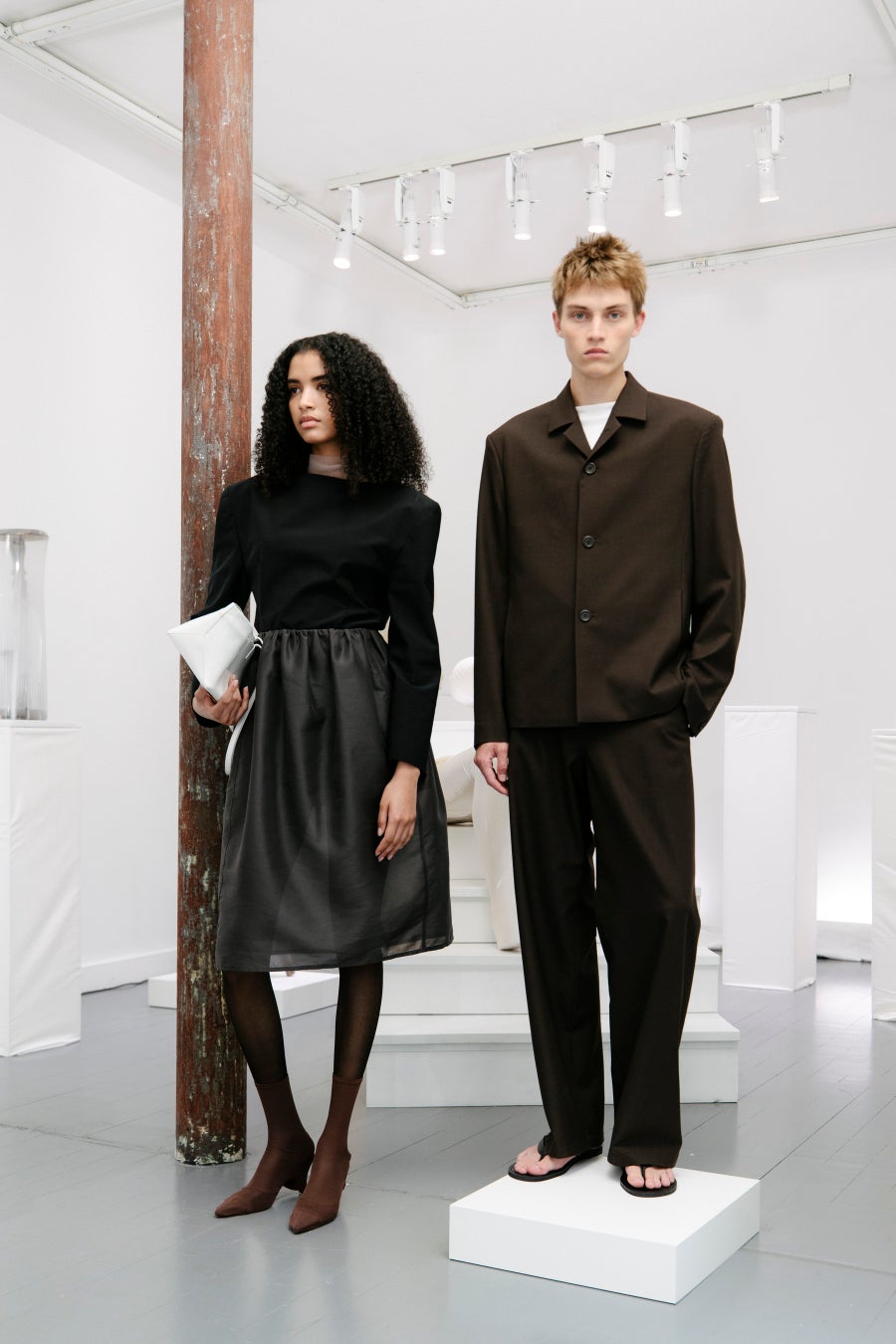 カラーパレットは主に、ホワイトとダークブラウンを基調とし、グレー、チャコール、ブラックのニュートラルトーンで強弱のバリエーションを表現しています。アクセントになるカラーパレットは、くすんだピンク、ビートレッド、シアンブルーでほんのり彩られ、過去と現在をつなぐ統一感のある色合いが生まれています。ブランド創立以降、一貫して示されてきた AMOMENTO の控えめなデザインの核と建築的なシルエットを、25SS コレクションを通して体験していただけます。