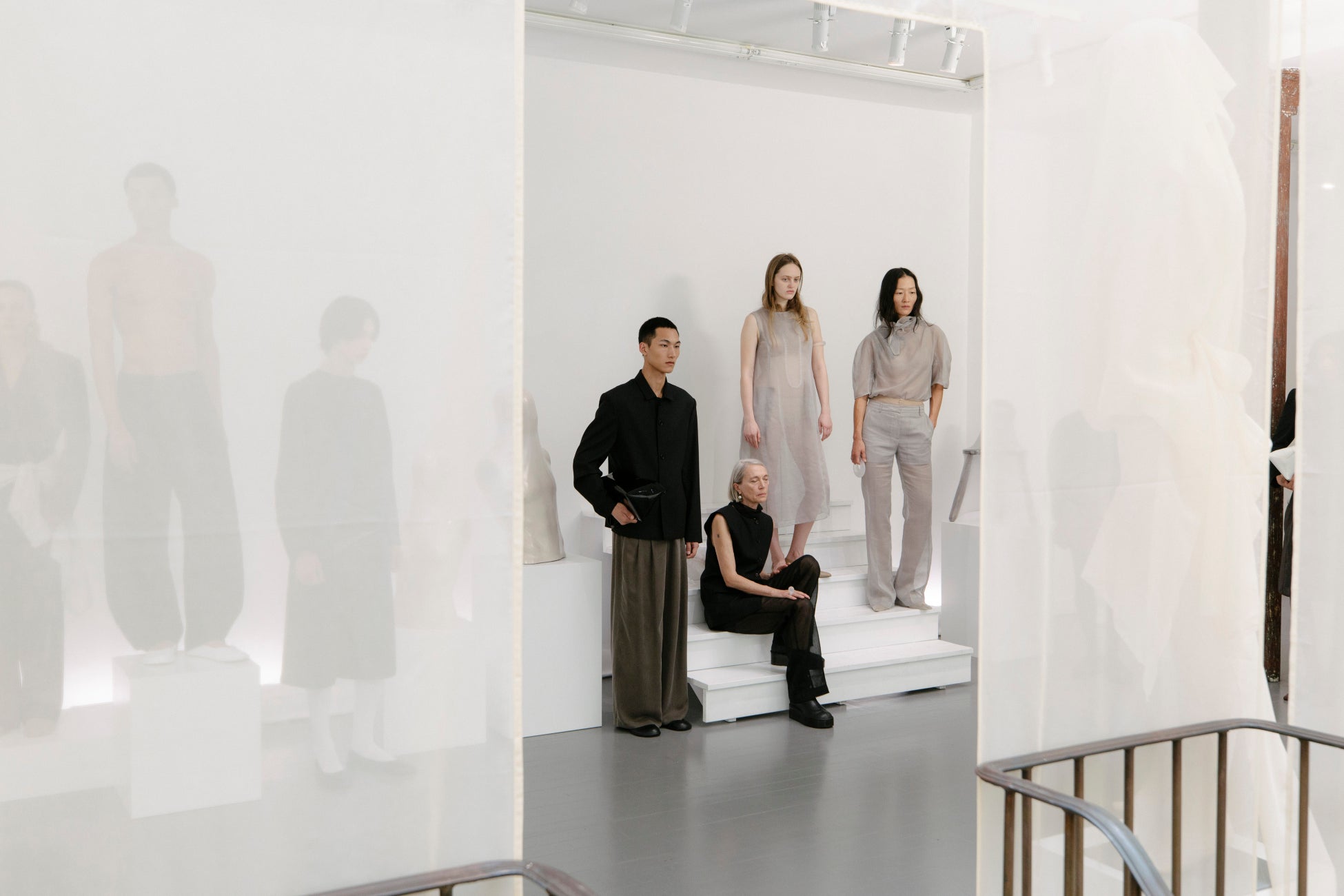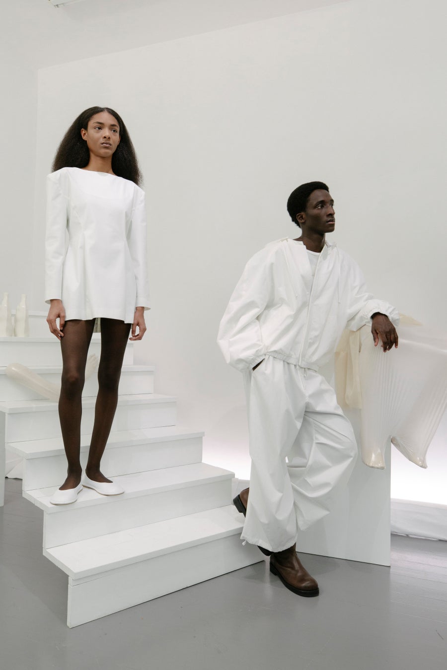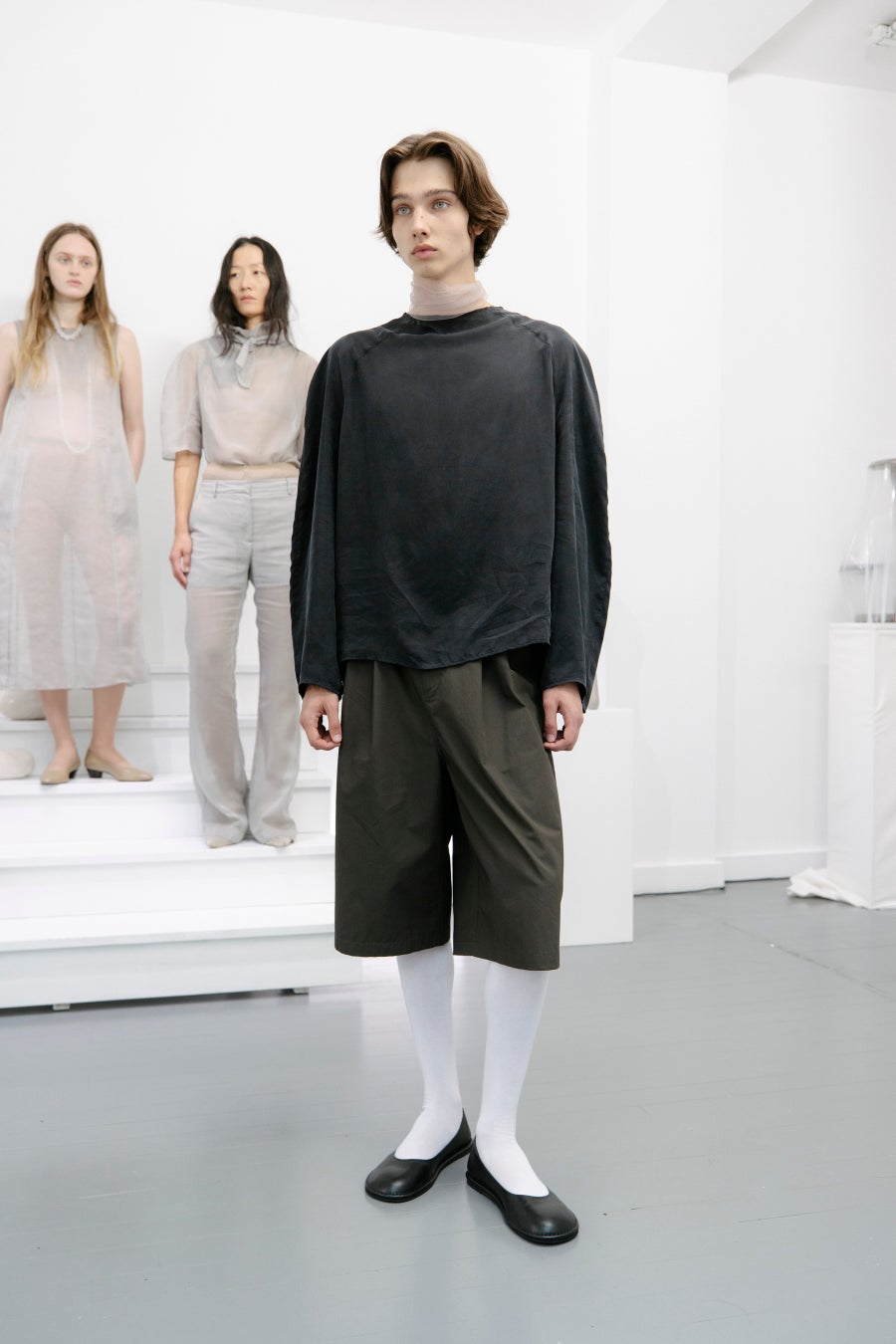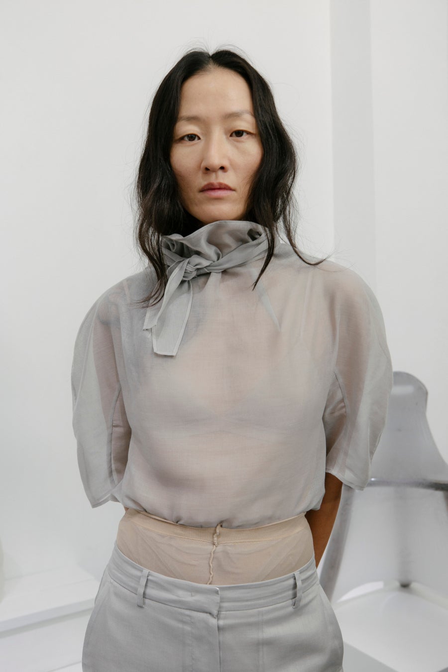 ストレートラインのテーラリングに焦点を当て、クラシックな魅力を引き立てつつ、AMOMENTO 独自のカーブラインが現代的でミニマルなシルエットを生み出しています。オーガンザやナイロンなどのシアーな素材が体を包み込み、シーズンのメッセージを強調しています。サイドシームを用いないことや、ポケットをシームライン沿いに配置するなど、隠されたディテールがミニマリスティックなシルエットに焦点を当てています。