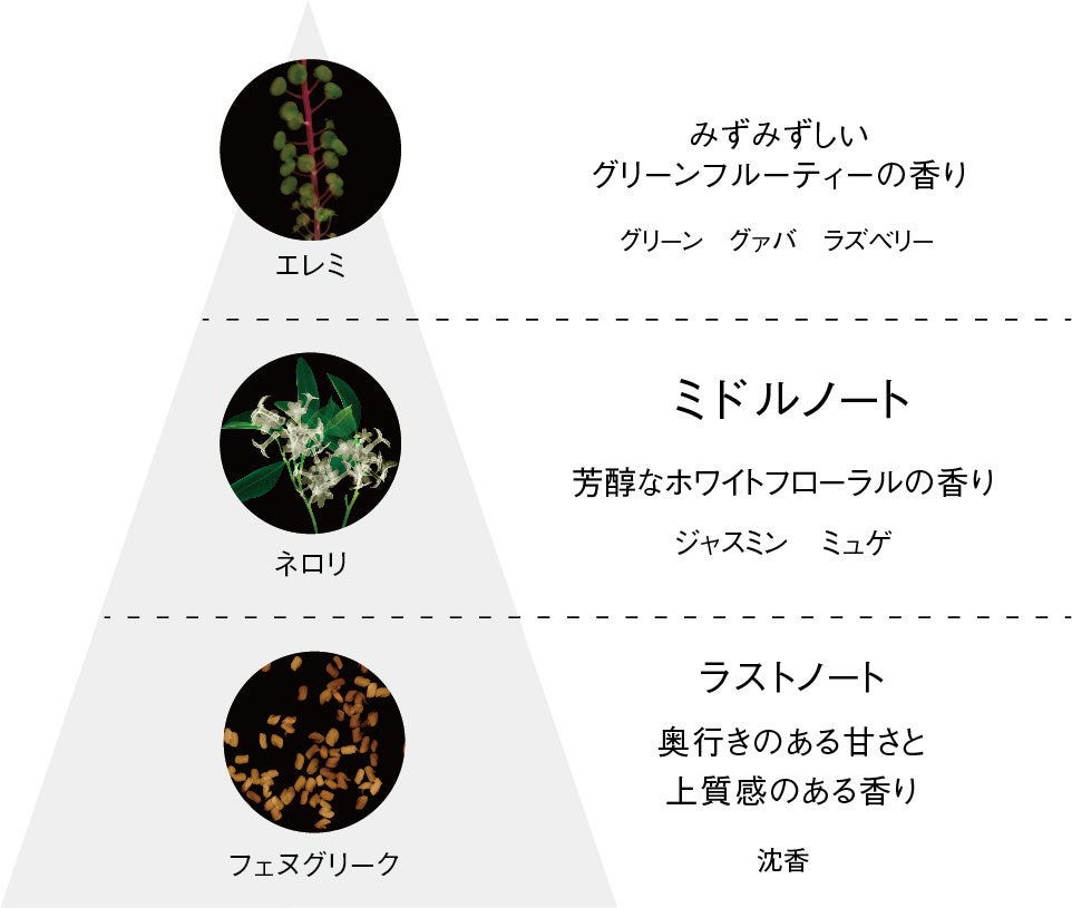 ・シプレフローラル調に華やかなブーケをきかせた、前向きな気分へといざなうような香り。
