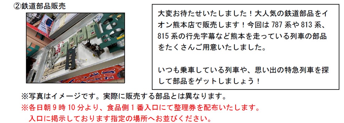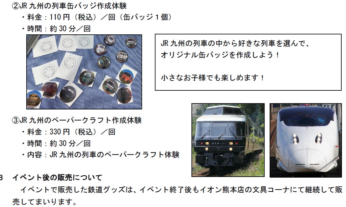 イオン九州株式会社とJR九州商事株式会社では、イオン熊本店(熊本県上益城郡嘉島町大字上島字長池2232)にてイベント「イオン鉄道フェスタ」を開催。