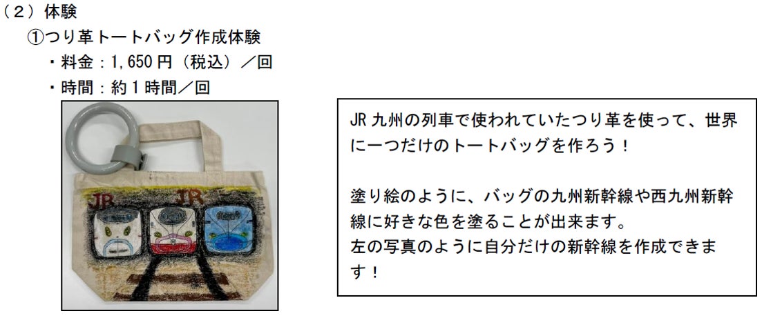 また、JR九州の列車で実際に使用していたつり革を使ったトートバッグ作成体験や缶バッジ作成体験の他、鉄道グッズ・鉄道部品の販売も行います。大人も子どもも、ご家族でお楽しみいただけるイベントです。