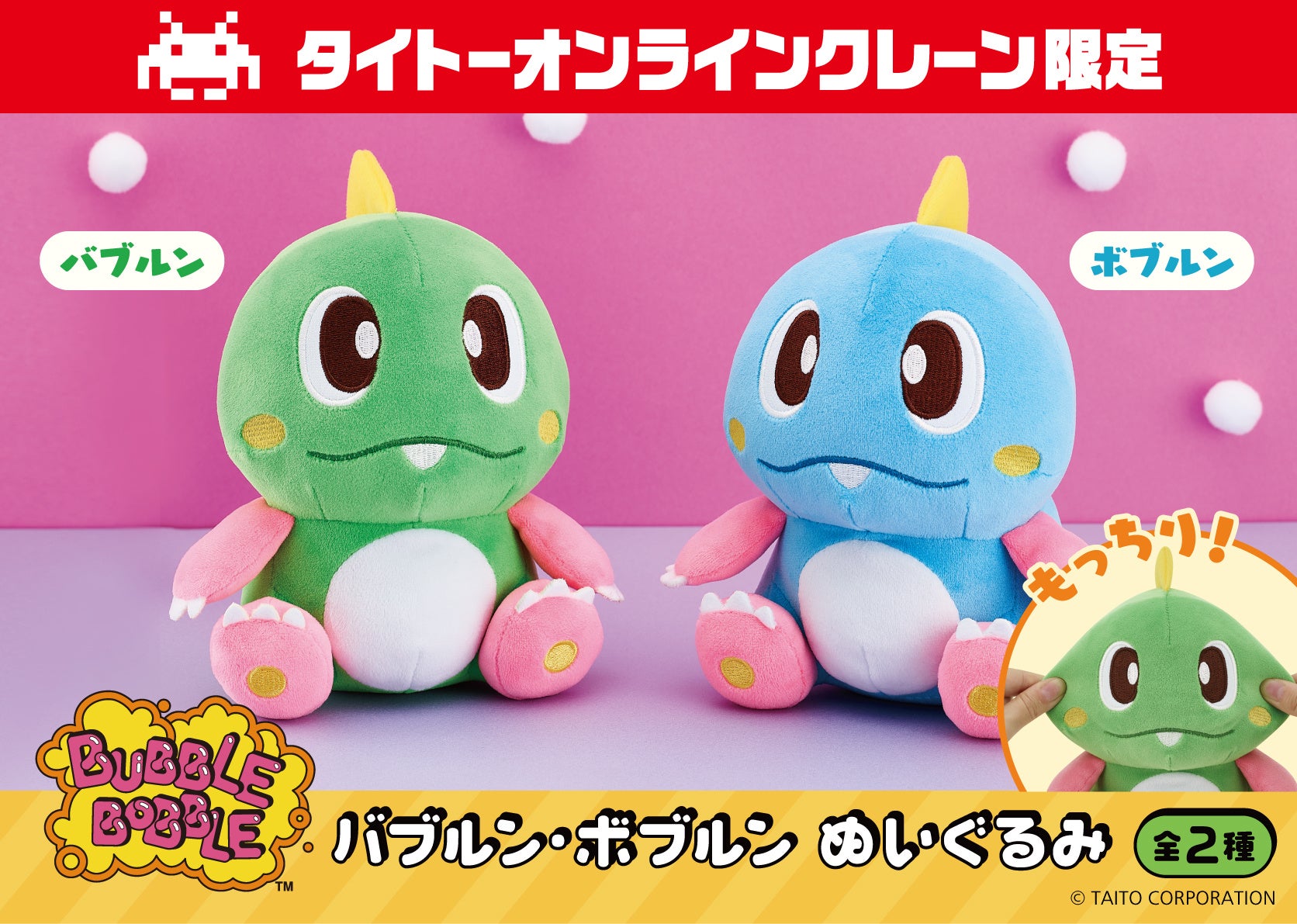 『バブルボブル』シリーズの主人公のバブルンとボブルンのぬいぐるみが、12月3日(水)にタイクレ限定で登場します。20cmのサイズのぬいぐるみで、国内でバブルンのぬいぐるみが登場するのは11年ぶりとなります。是非この機会にゲットしてください。
