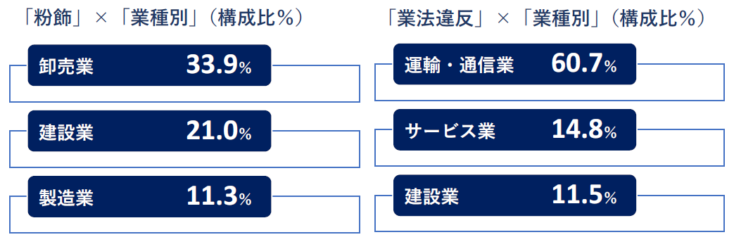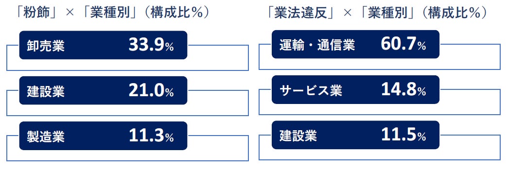 「粉飾」を業種別にみると、「卸売業」の構成比が33.9%と他の業種と比較して高かった。なかでも架空取引や融通手形を使用していたケースが目立った。「業法違反」では、「運輸・通信業」が構成比60.7%と突出していた。長時間労働など違法な営業活動が発覚して、行政処分を受けた企業が多数発生した。