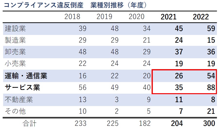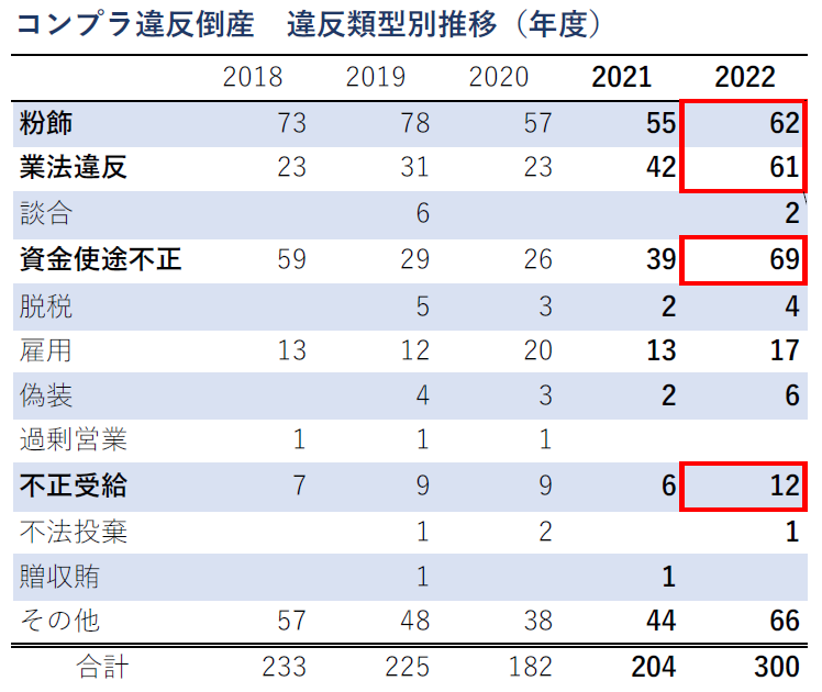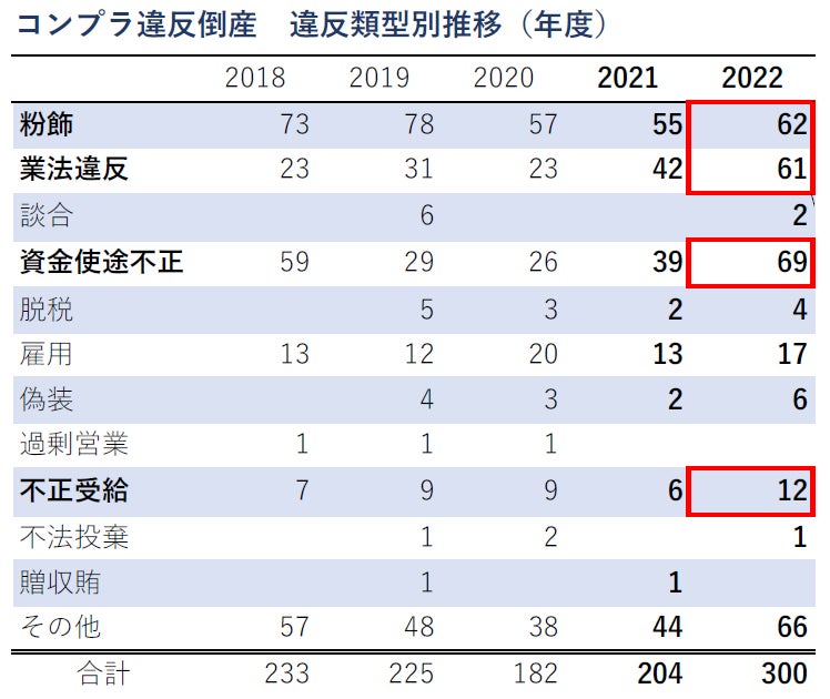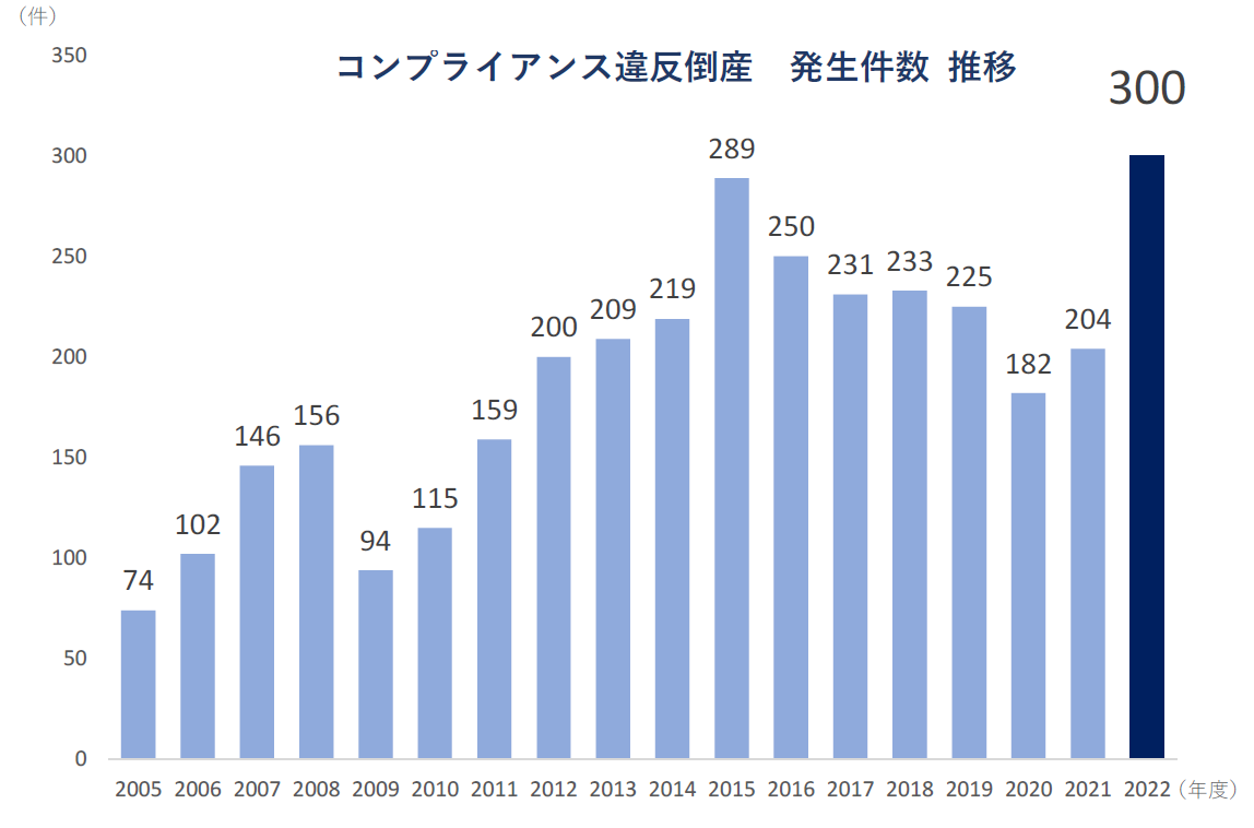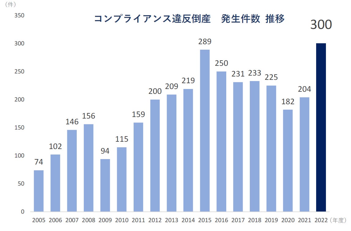 2022年度のコンプライアンス違反倒産は300件と前年度から96件(147.1%)増加し、2年連続で前年度を上回った。また、これまで最多であった2015年度の289件を上回り、2005年4月の集計開始以来、最も多くなった。