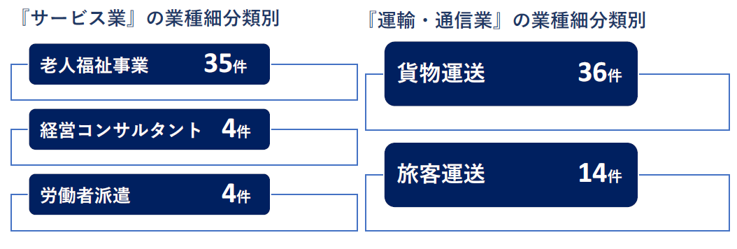 業種別では、『サービス』『建設』『運輸・通信』が目立つ