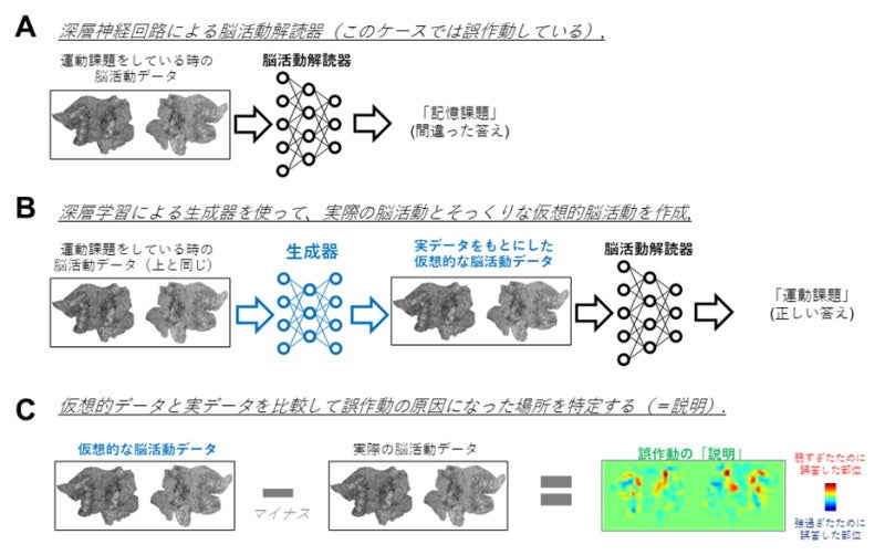 A)運動課題を遂行中の脳活動データに対して、深層神経回路の解読器は「記憶課題」と間違えた答えを出した。複雑な解読器が何故誤作動したのかを説明することは、このままでは難しい。