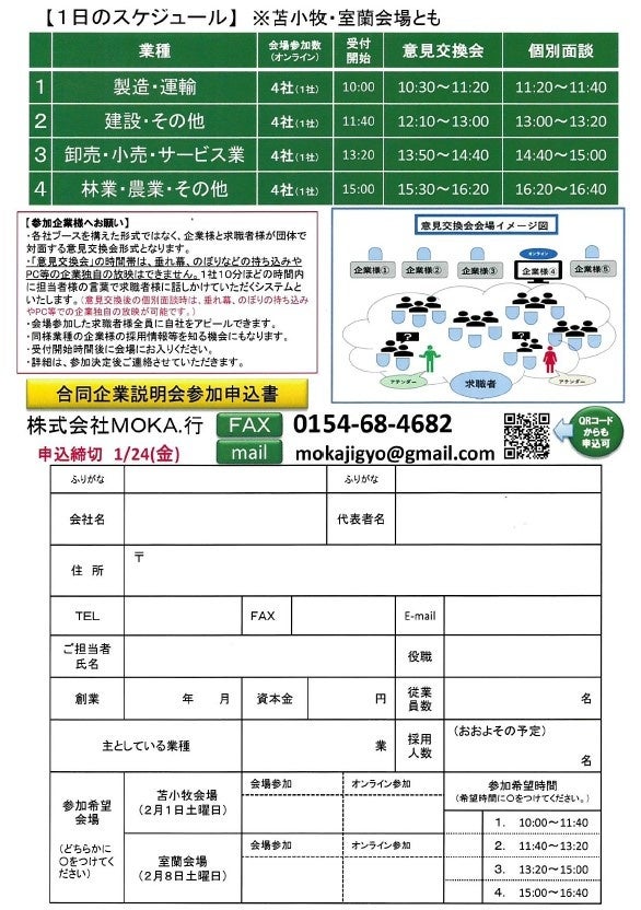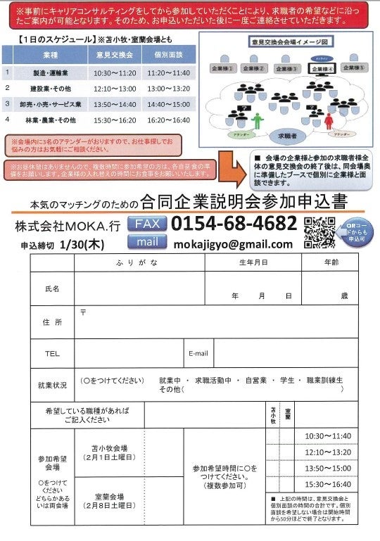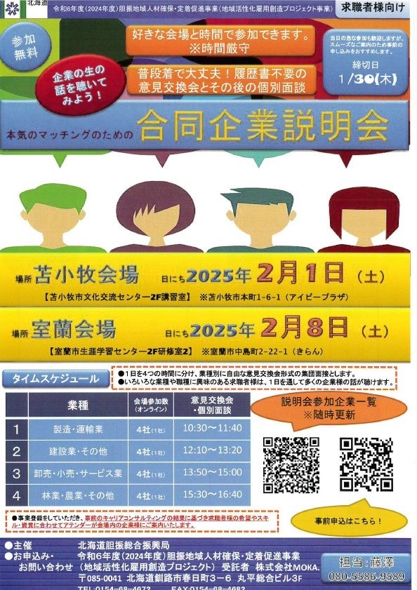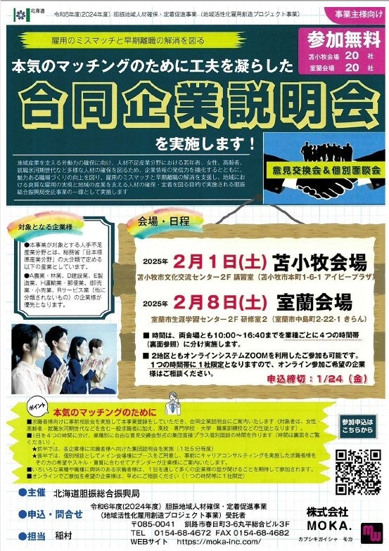 北海道胆振総合振興局では、地域産業を支える労働力の確保に向け、地域における良質な雇用の実現と地域産業を支える人材の確保・定着を図るため、2月上旬に合同企業説明会を北海道苫小牧市、室蘭市で開催することとし、参加事業者、参加求職者を現在募集しております。