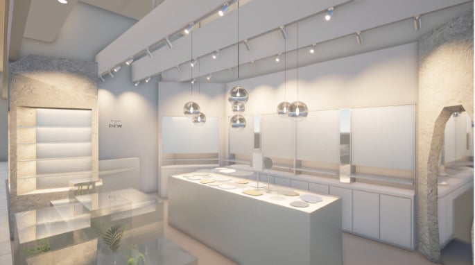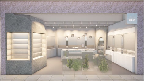 旬なトレンドとベーシックのバランスが魅力の「ガーランドオブデュウ」。リニューアルするルクア店はコンセプトを新たに「無機質と生命」とし、岩や天然石、植物や光によって、その世界観を表現した店舗となっています。