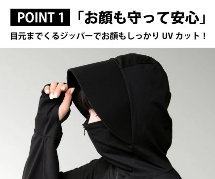 フード+フェイスカバー+指穴仕様で、顔・首・手の甲まで“隙なし”でガードします。