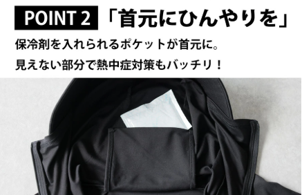 外からは見えない設計ながら、首元をひんやり冷やすことで暑い日の熱中症対策にも役立ちます。