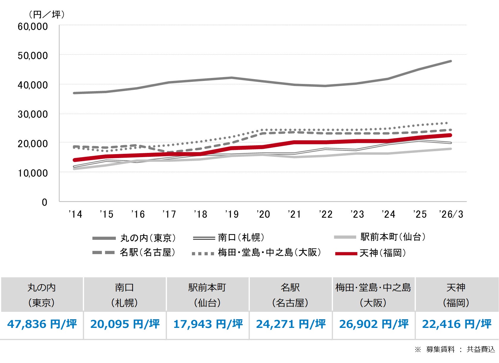 <募集賃料の推移(6大都市 大規模ビル・主要駅前地区)>