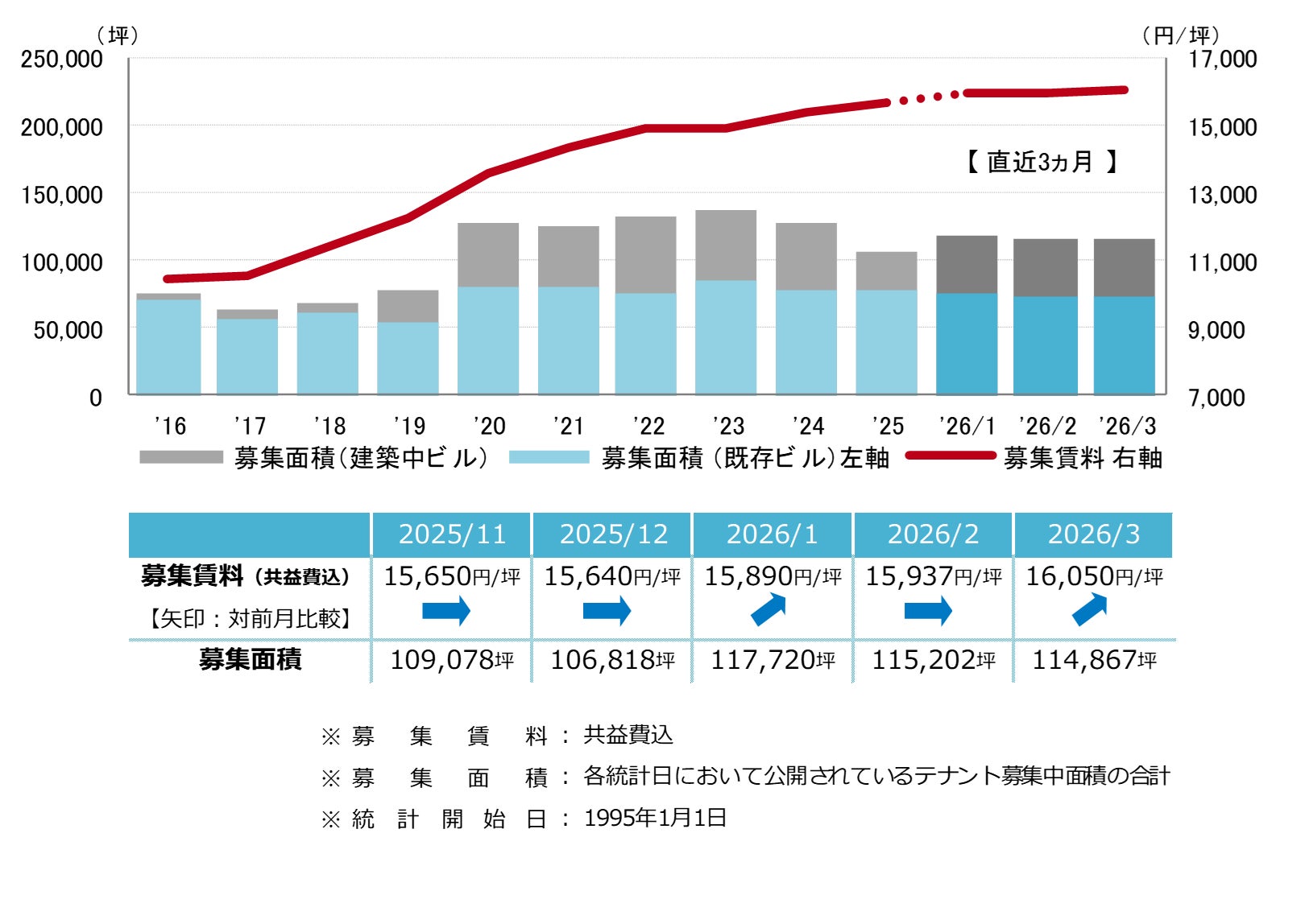 募集賃料は前月比プラス113円/坪の16,050円/坪となった。3ヵ月連続の上昇で16,000円/坪台となり、募集賃料は2000年以降の最高値更新が継続している。