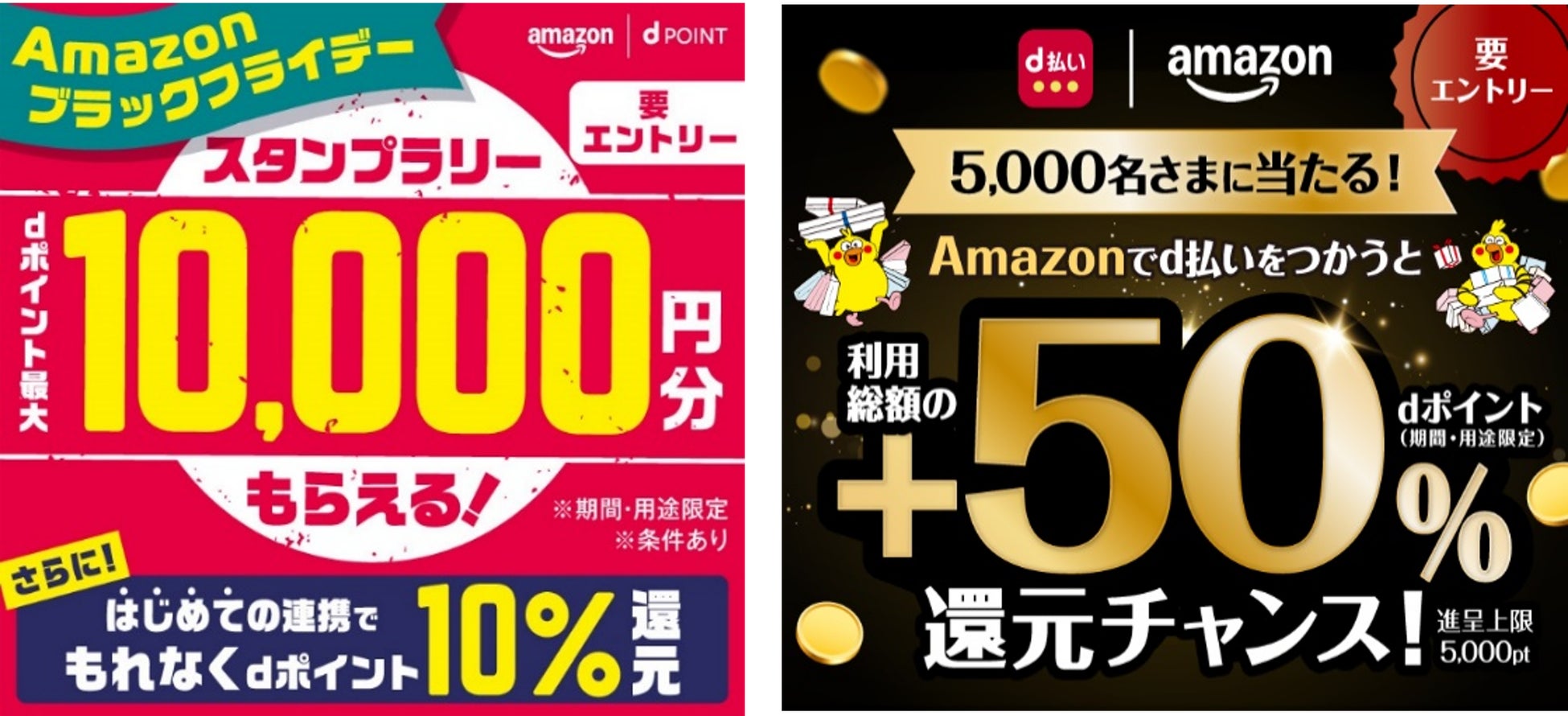 株式会社NTTドコモ(以下、ドコモ)は、Amazonブラックフライデー開催に伴い、「【Amazonブラックフライデー】 dポイントスタンプラリー 最大10,000円分がもらえるチャンス」および「5,000名さまに当たる!Amazon.co.jpでd払いをつかうとdポイント+50%還元キャンペーン」を、2025 年11月21日(金)から2025年12月1日(月)までの期間で開催(※1)いたします。