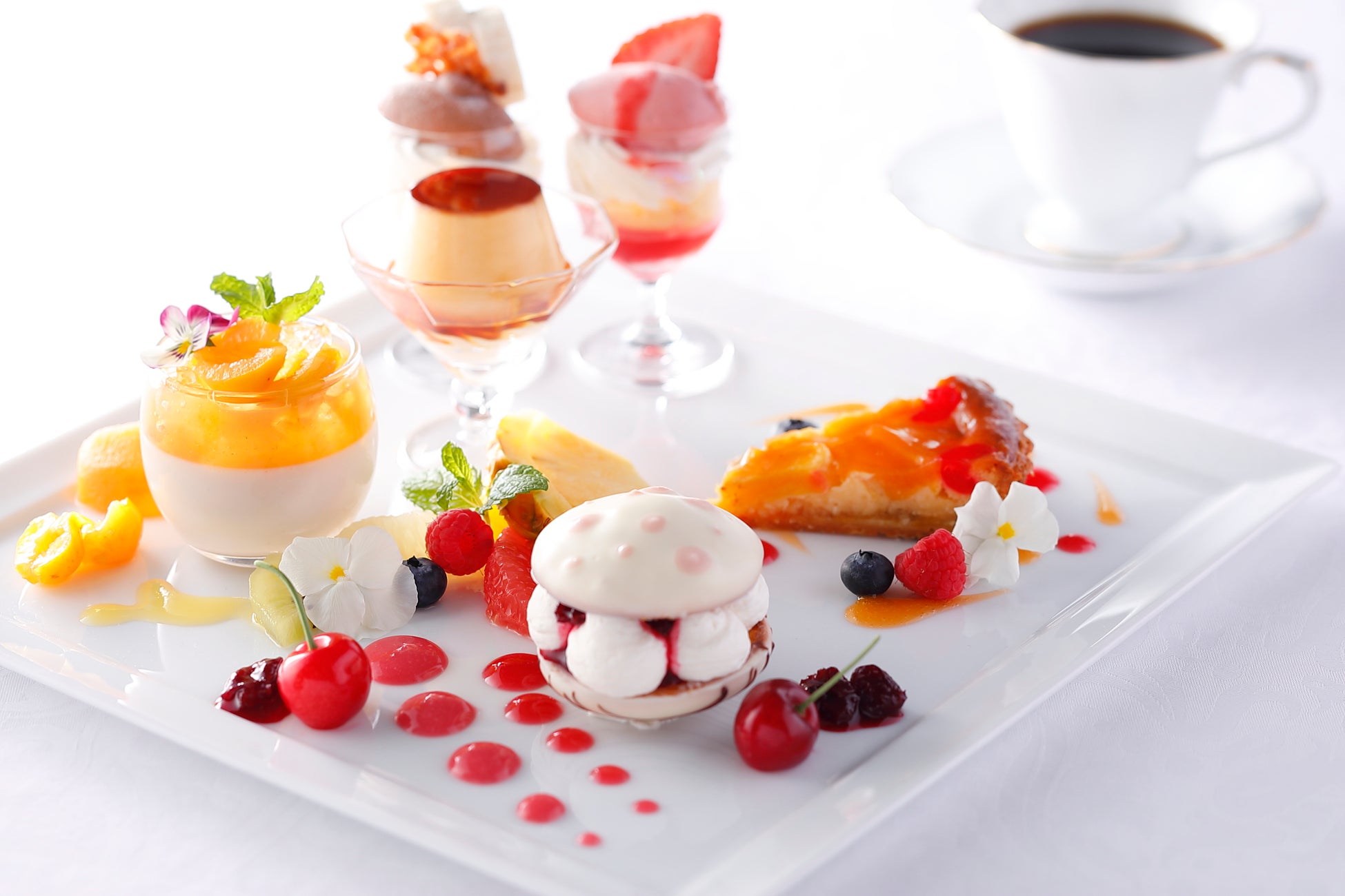 資生堂パーラー定番のストロベリーパフェ、チョコレートパフェ、カスタードプリンに、月替わりで季節のデザートをご堪能いただけるバリエーション豊かで贅沢なプレートです。