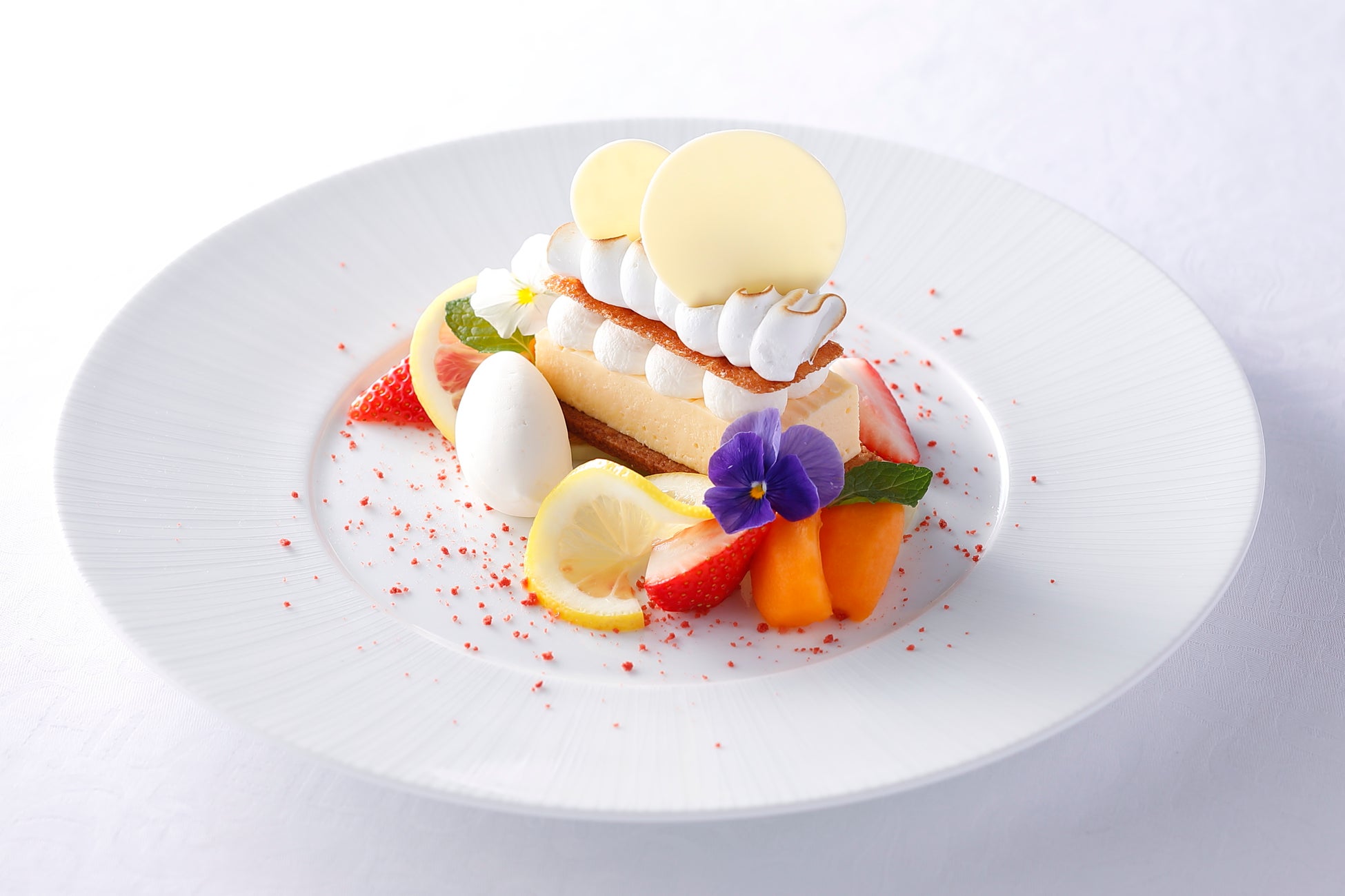 やさしい酸味が特長の瀬戸内レモンをお皿の上でタルトに仕上げました。ココナツサブレやチュイールなどと一緒に、いろいろな食感をお楽しみください。