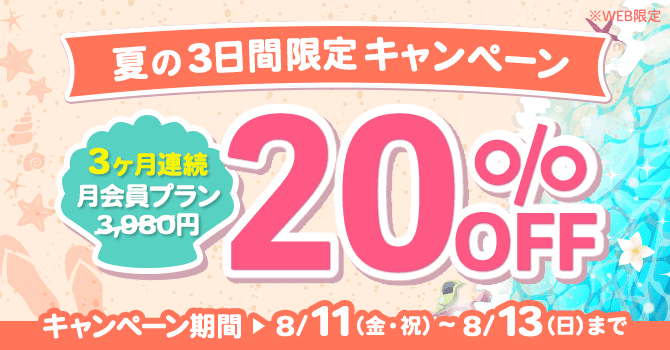 【キャンペーン概要】 期間:2023年8月11日(金・祝)~8月13日(日) 内容:月会員プラン定価3,980円→3,180円(20%OFF) ご登録から3ヶ月間は毎月キャンペーン価格が適用 |