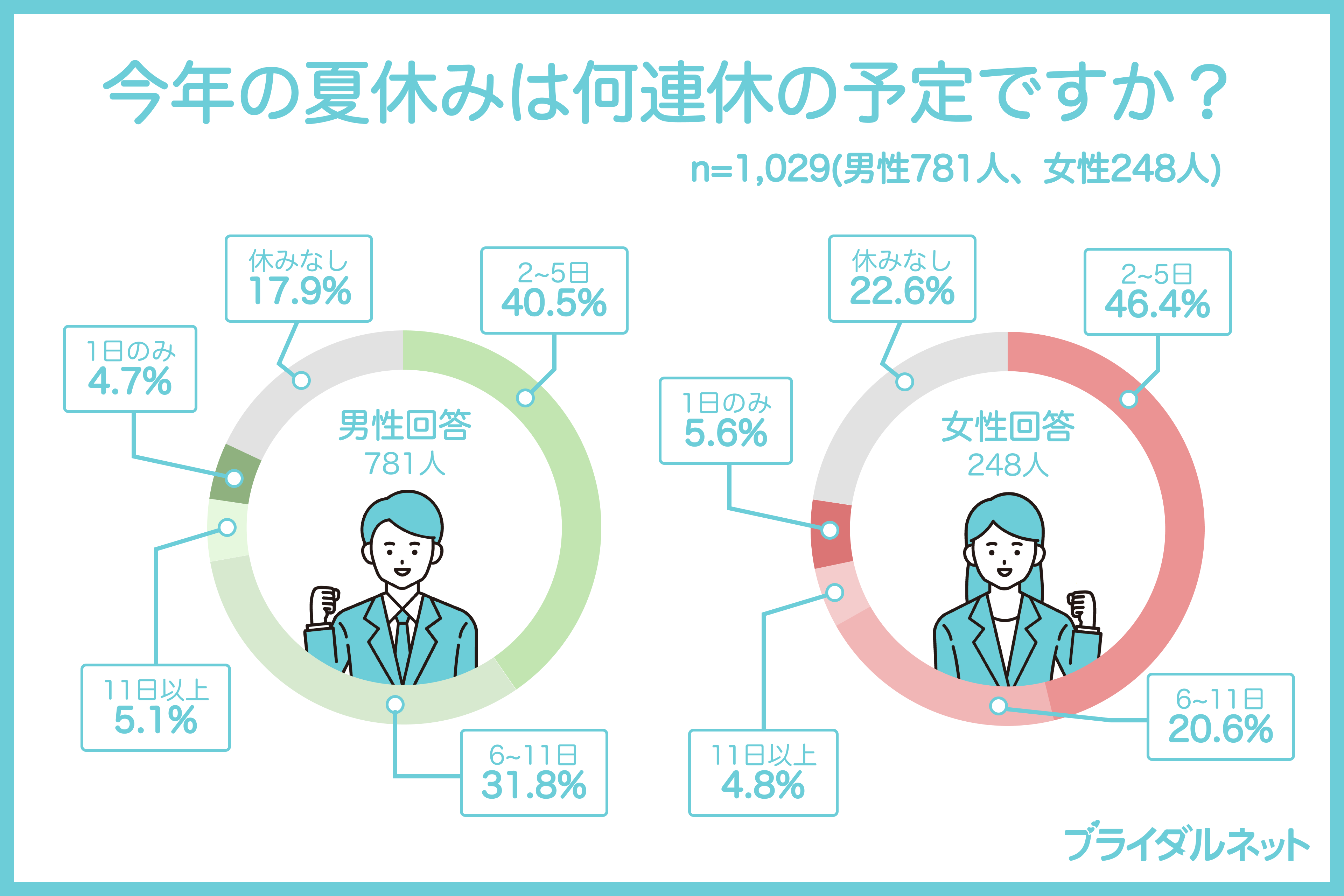 婚活男女の夏休みの取得日数を調査したところ、「2~5日」の連続休暇を取得すると回答した男性が40.5%、女性は46.4%で最多。通常の休日に有給休暇を1~3日程度追加して、休暇を取る方が多いようです。