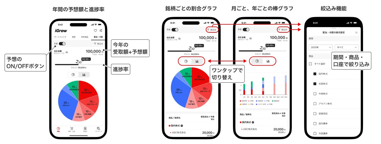 楽天証券株式会社(本社:東京都港区、代表取締役社長:楠 雄治、以下「楽天証券」)は、本日、2025年6月27日(金)より、スマートフォン向け資産づくりアプリ「iGrow🄬」に、新たに配当・分配・利金の管理機能を追加したことを、お知らせします。これにより、お客様は、保有する金融商品から得られる収入について、実際に得た金額はもちろん、業界で初めて(※1)年間で得られる予想金額(※2)もグラフなどを用いて視覚的に確認することが可能になりました。