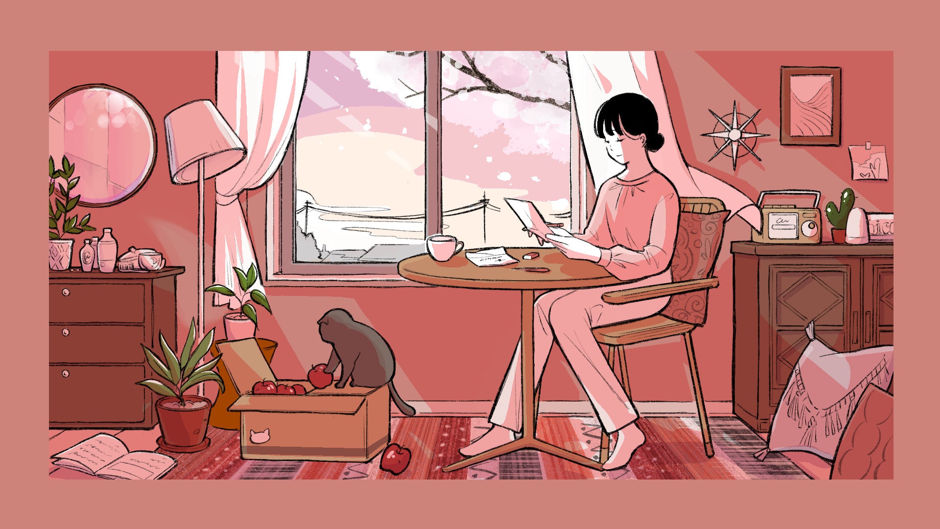 赤い土を連想させるテラコッタカラーで描く、穏やかな夕暮れ時に大切な人へ手紙を書く部屋。部屋の中に落ちた影や、聞こえてくる子供たちの楽しげな声が、暮れ時の穏やかであたたかな情景を描いています。「シャープペンシル」、「プラスチック消しゴム」、「携帯ハサミ」がアニメーション内に登場します。