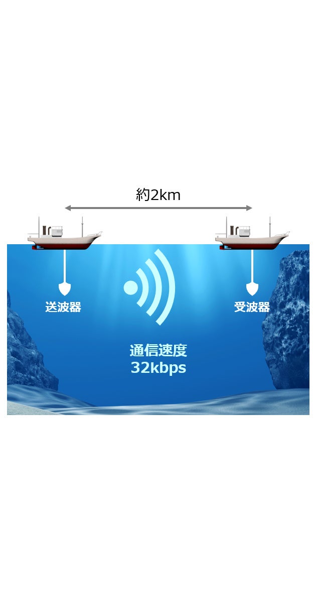 OKIは開発した水中音響通信技術を用いて、2023年3月に駿河湾海中の海域で実証実験を行いました。本試験では試験船2隻から通信用の送受波器を海面から約15mに吊り下げた状態で、2隻間の距離を約2km離してデータ送信を行い、通信速度32kbpsで安定した状態が確保できることを確認しました。