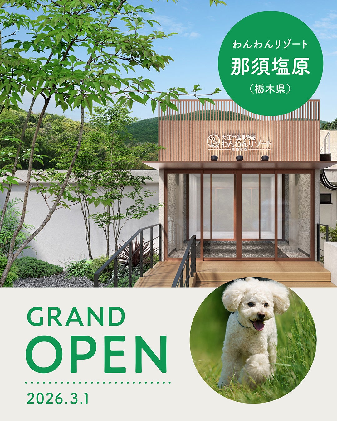 全国に73施設の温泉ホテル・宿やテーマパークを展開するGENSEN HOLDINGS株式会社(本社:東京都中央区、代表取締役:川﨑俊介)は、2026年3月1日(日)の「わんわんリゾート 那須塩原」「わんわんリゾート 西伊豆」の2館同時オープンを記念し、わんわんリゾートの公式Instagramおよび大江戸温泉物語グループの公式Xにて、いいふろギフト券が当たるプレゼントキャンペーンを3月1日(日)に同時開催いたします。